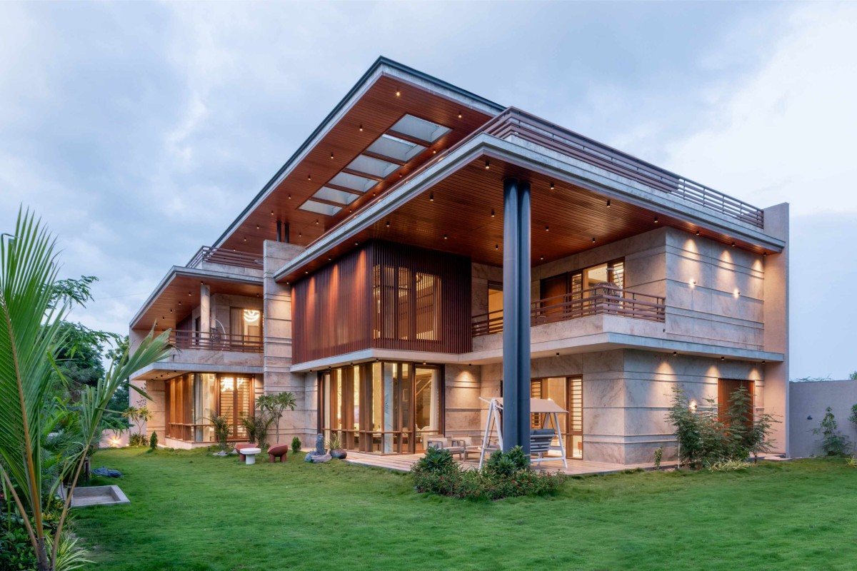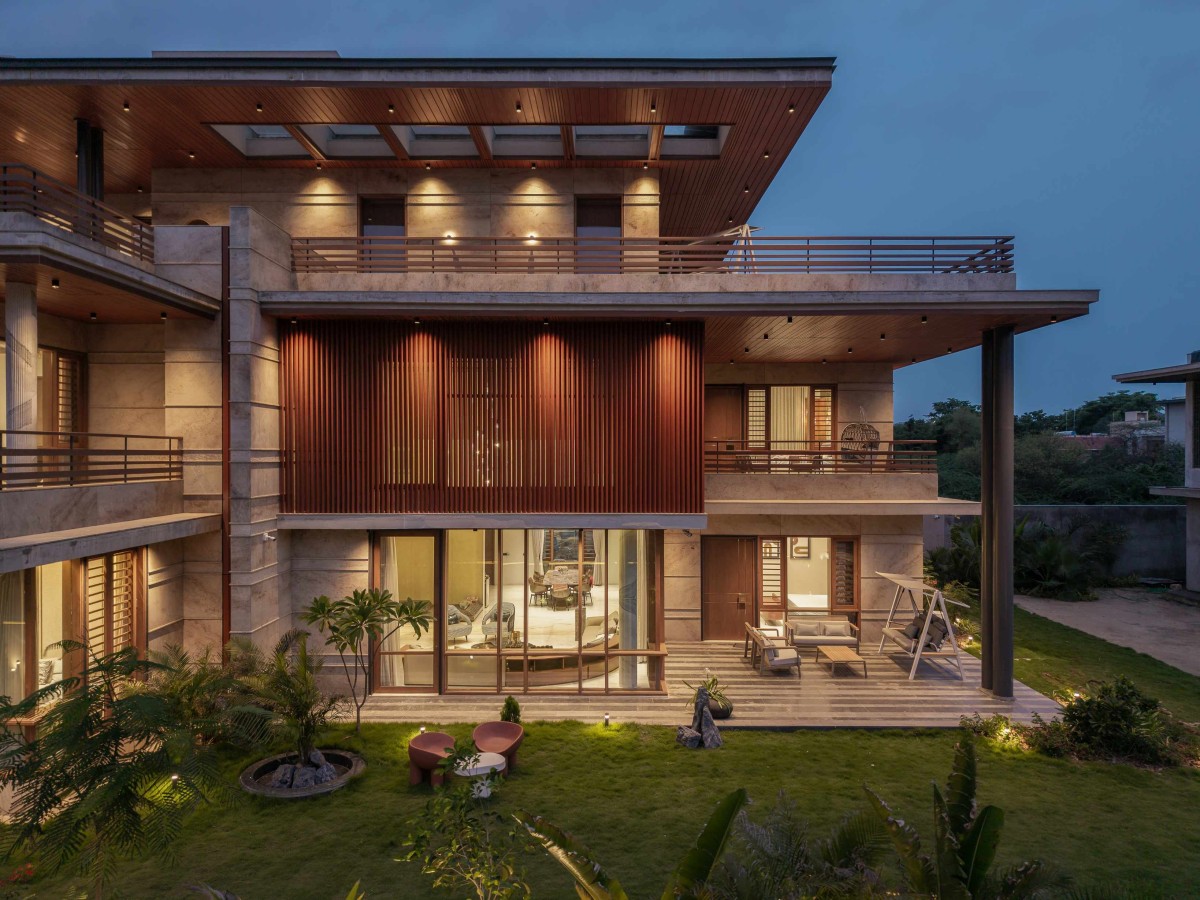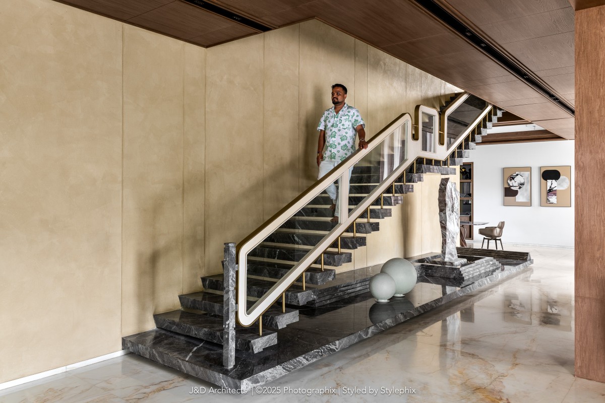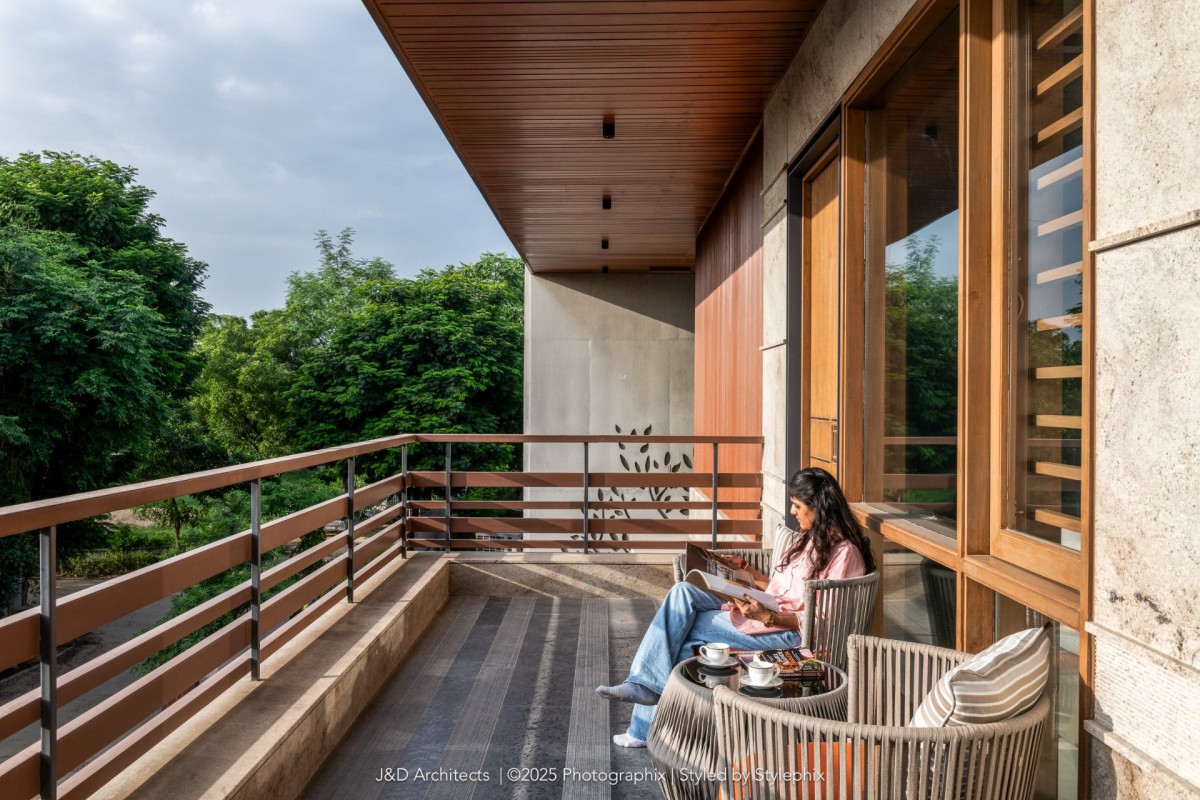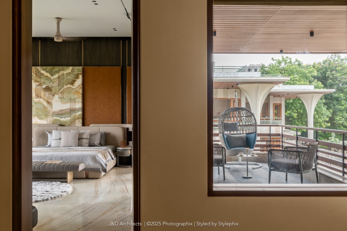A staircase gently climbs from ground to first, leading to the master’s sanctuary adorned with green onyx framing restful dreams, luxurious closets and baths beside. A terrace opens to endless green vistas. Beyond comes the Vijaybhai’s room that breathes quiet grandeur minimalist yet grand and elevating it with a beautiful walk in closet with indoor courtyard that truly feels like green indoors and the balcony views that capture garden’s soul.