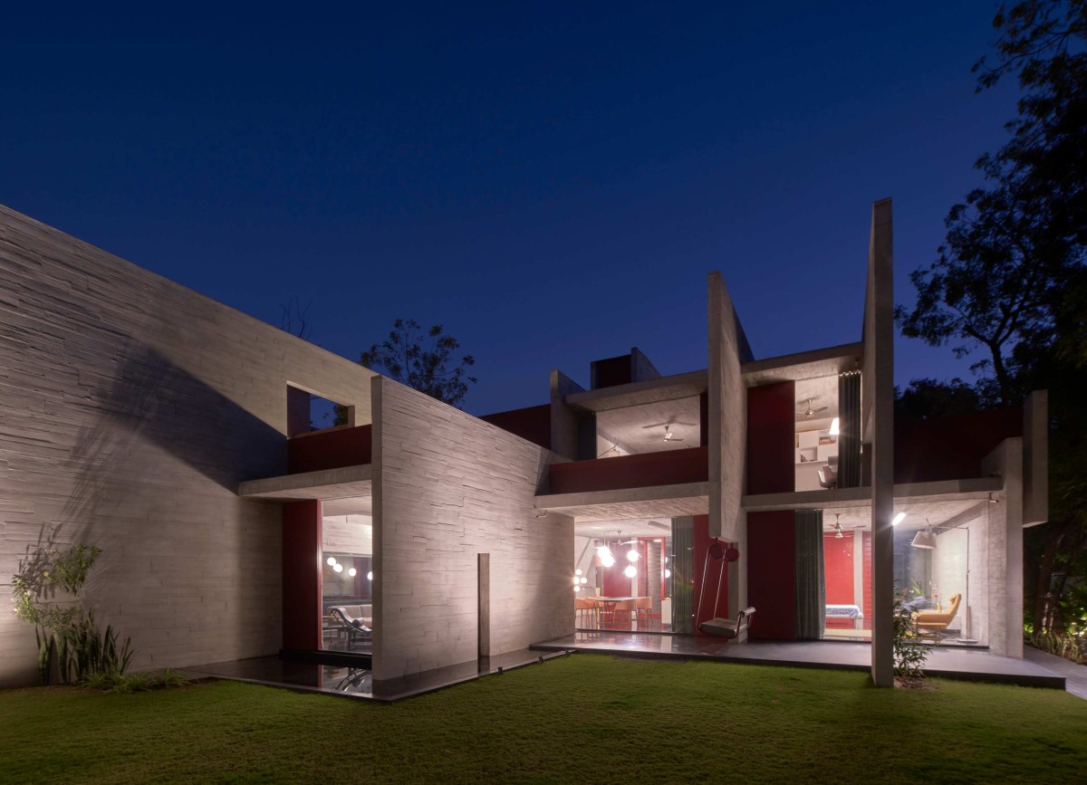 Night exterior view of Trees Sliced Through by Matharoo Associates