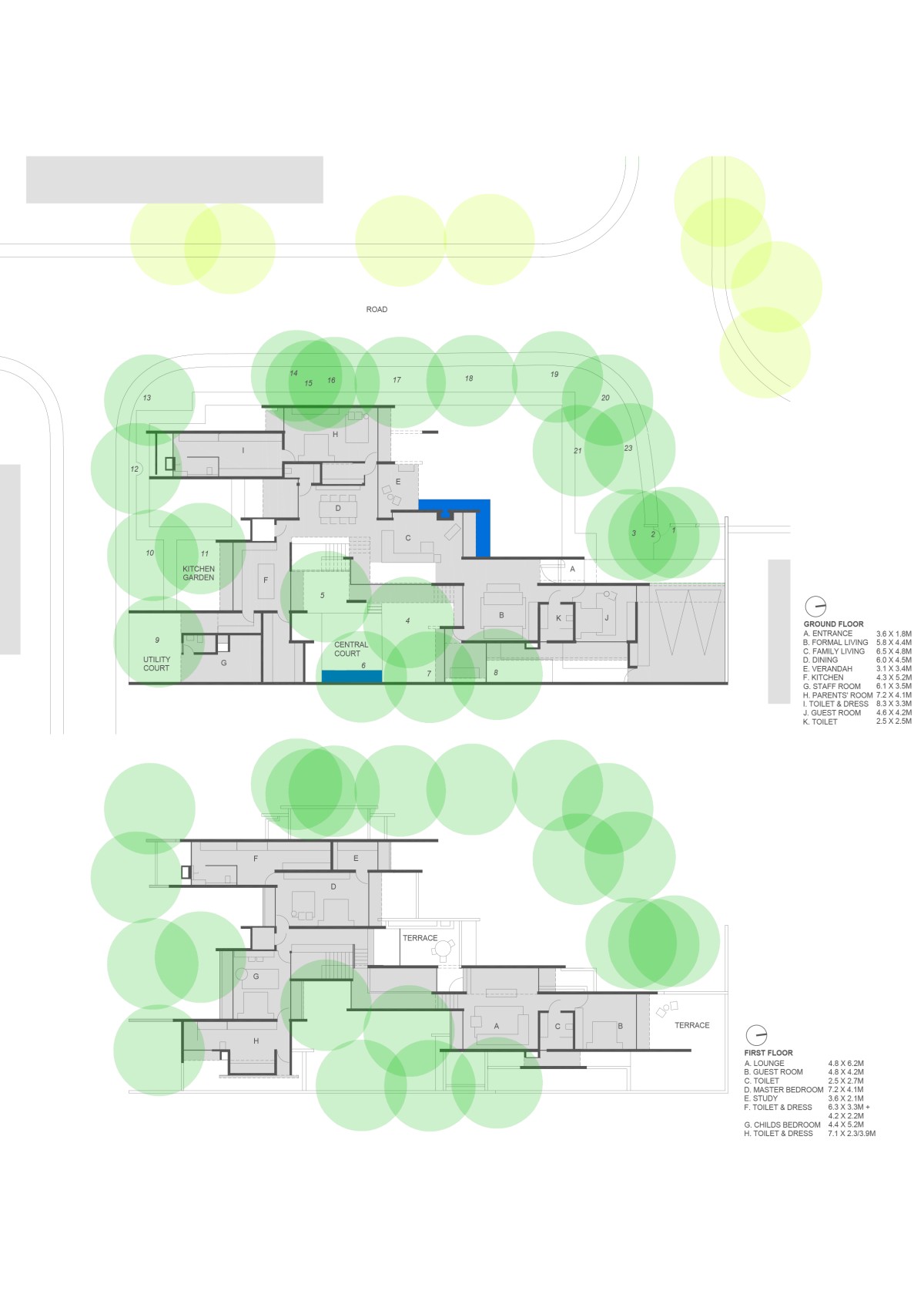 The third decision was to keep all spaces completely open on two sides so the trees would seamlessly be a part of the inside space. The rooms are all aligned to the North and South to get long views of the site and common landscaped plot beyond, and the 23 trees dictate the arrangement of the composition.