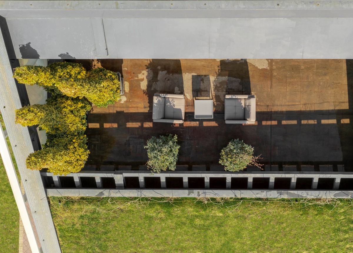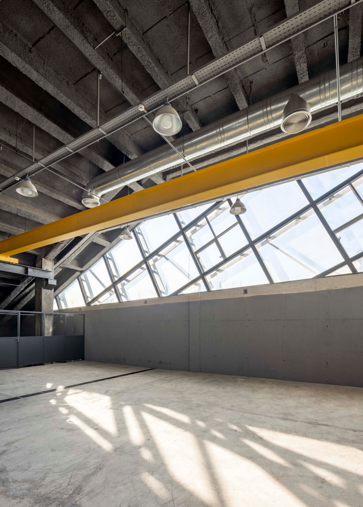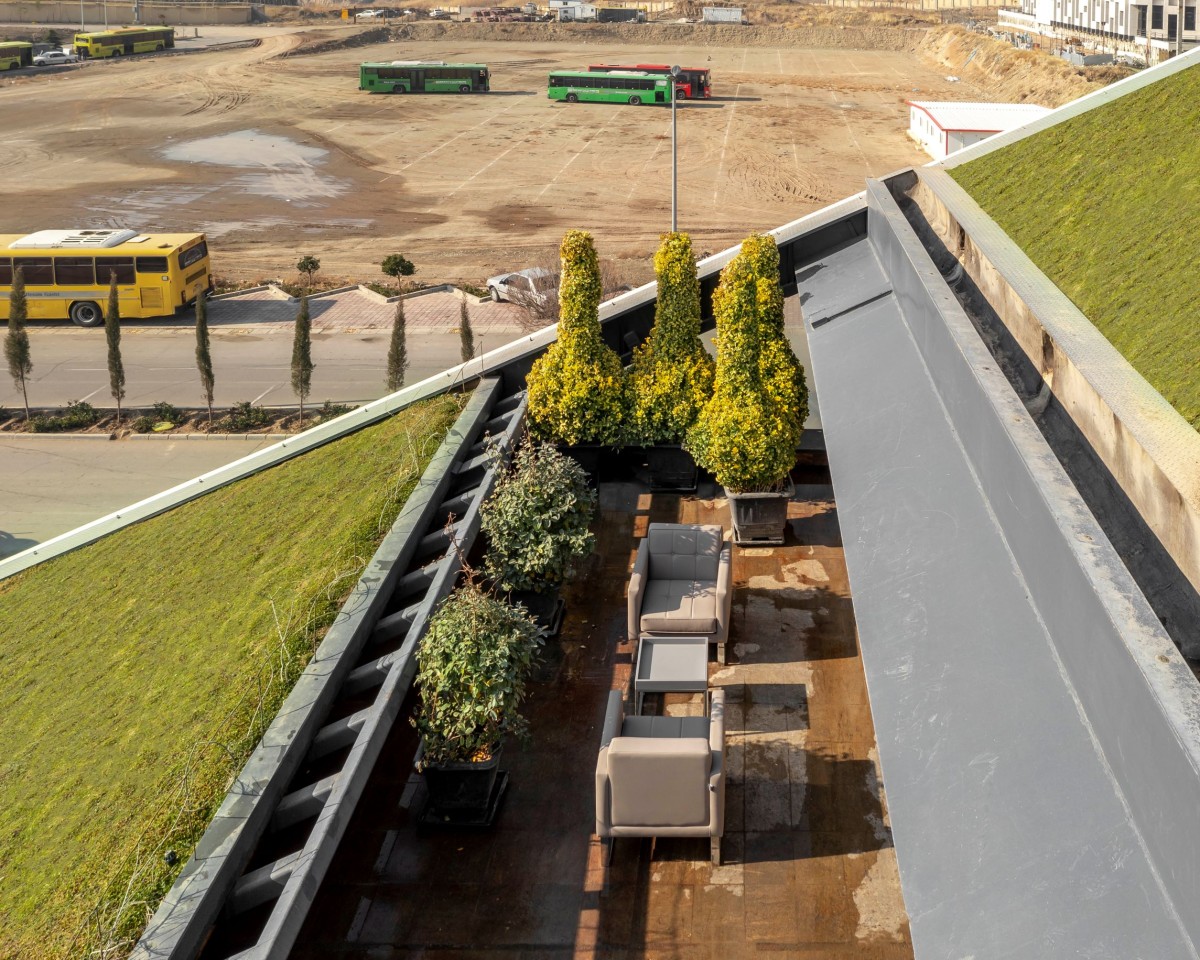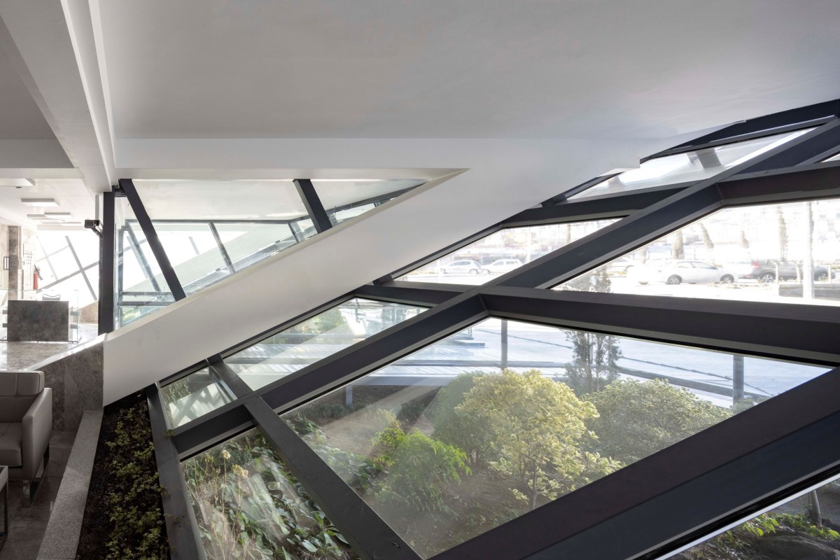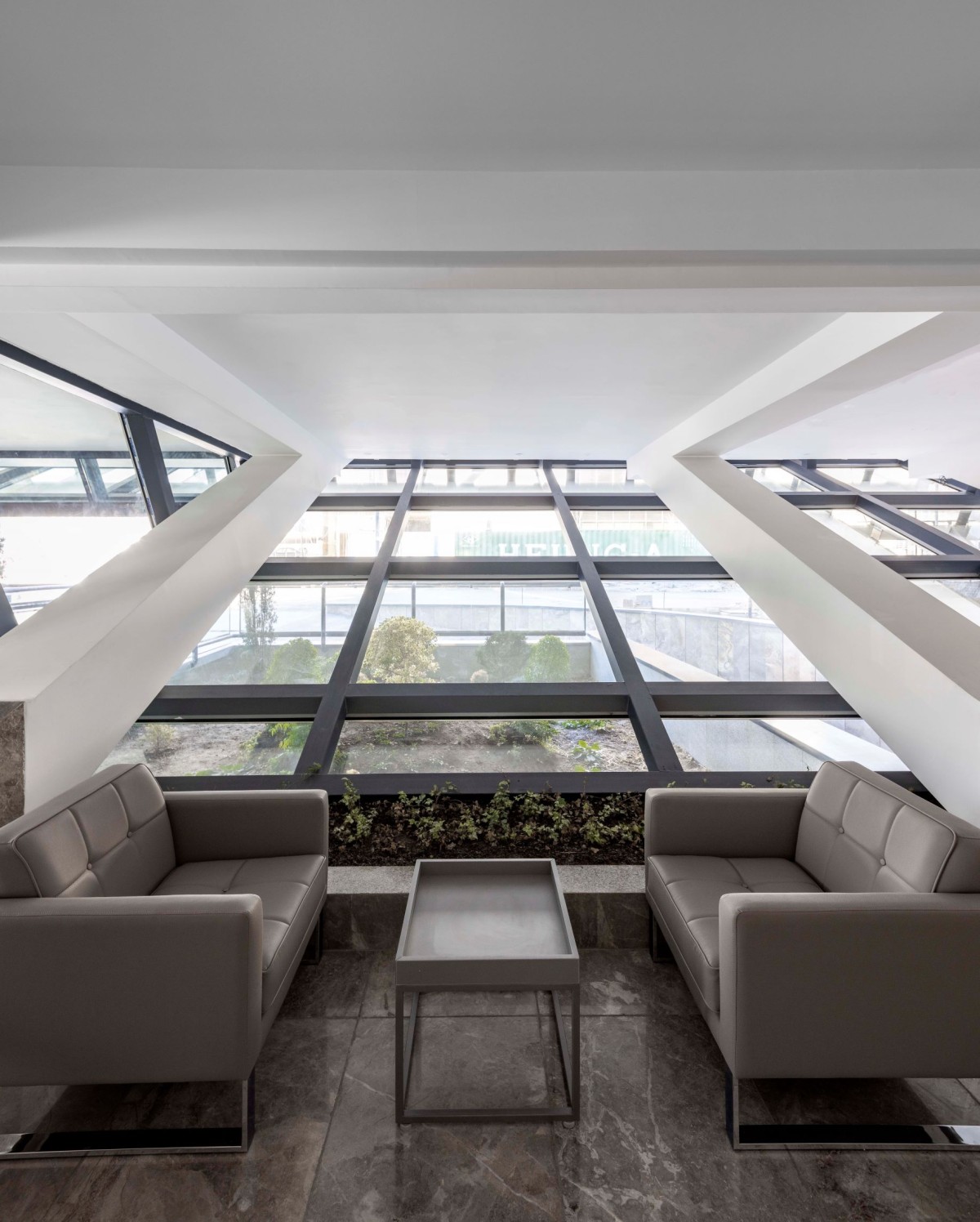 The cut-out roof creates a terrace which brings in natural light and airand forms a shared outdoor space for both visitors and employees to have an access to fresh air, interact and accomplish their work.