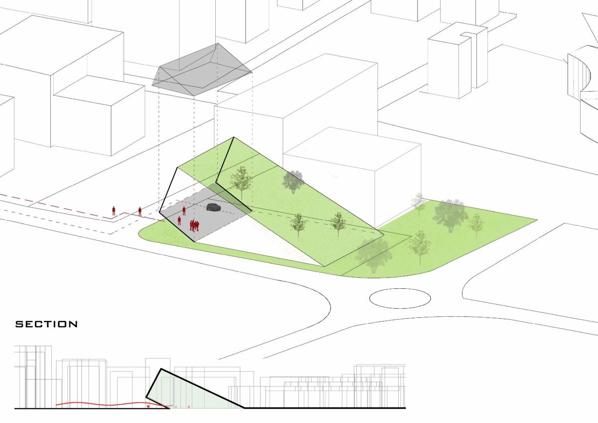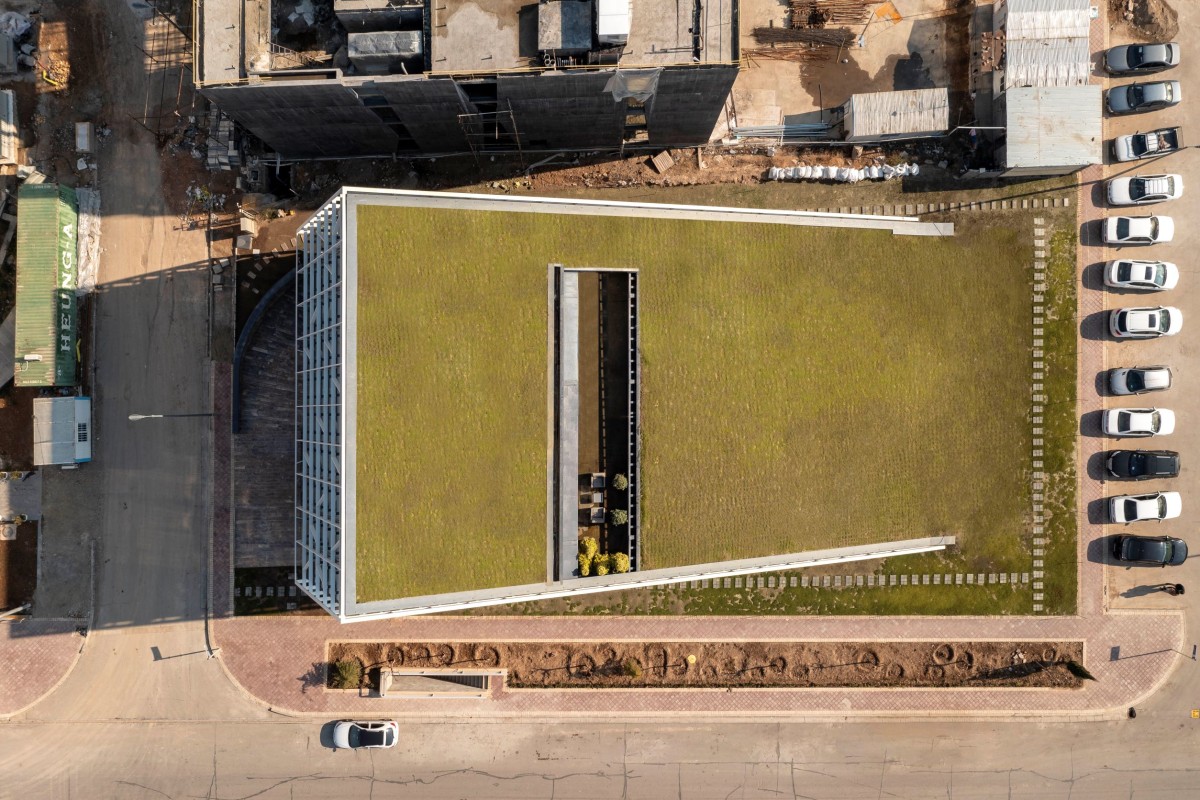 The inclined roof is voided throughout to create a green corridor from ground to roof to create a dynamic space, reduce building temperature and energy consumption. A water tank is also embedded next to the building to collect rainwater which will be used for the irrigation purposes and non-potable uses.