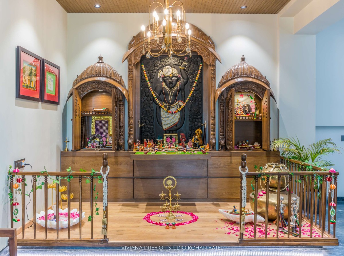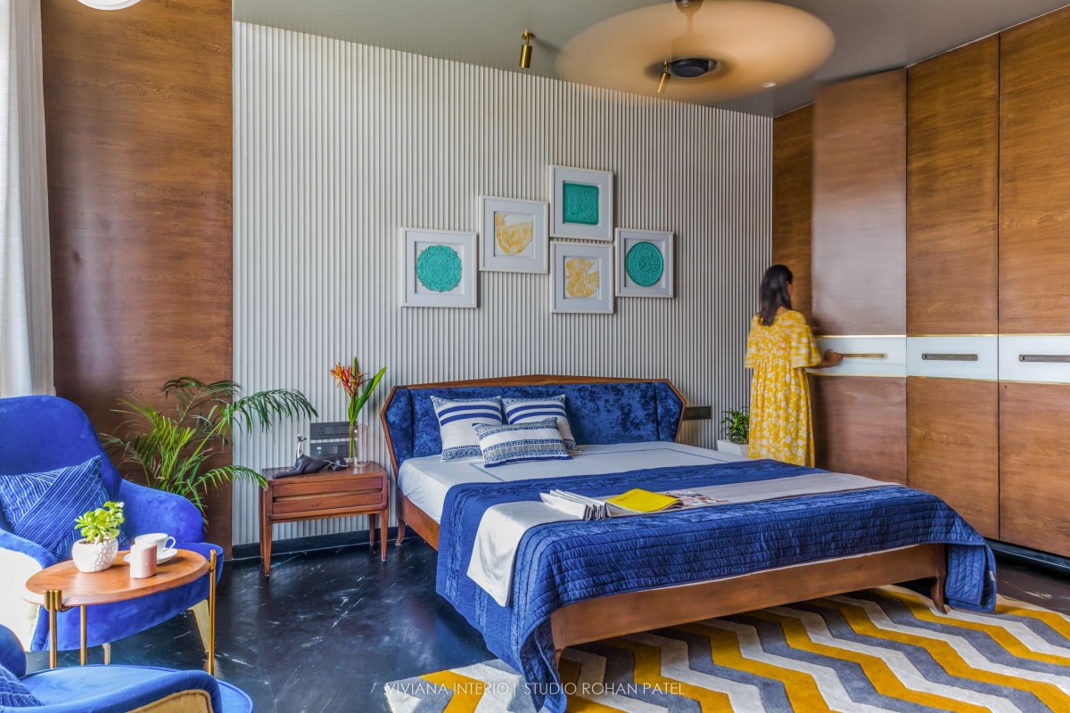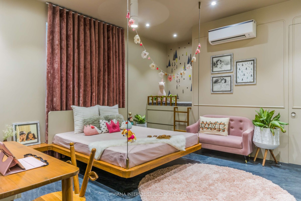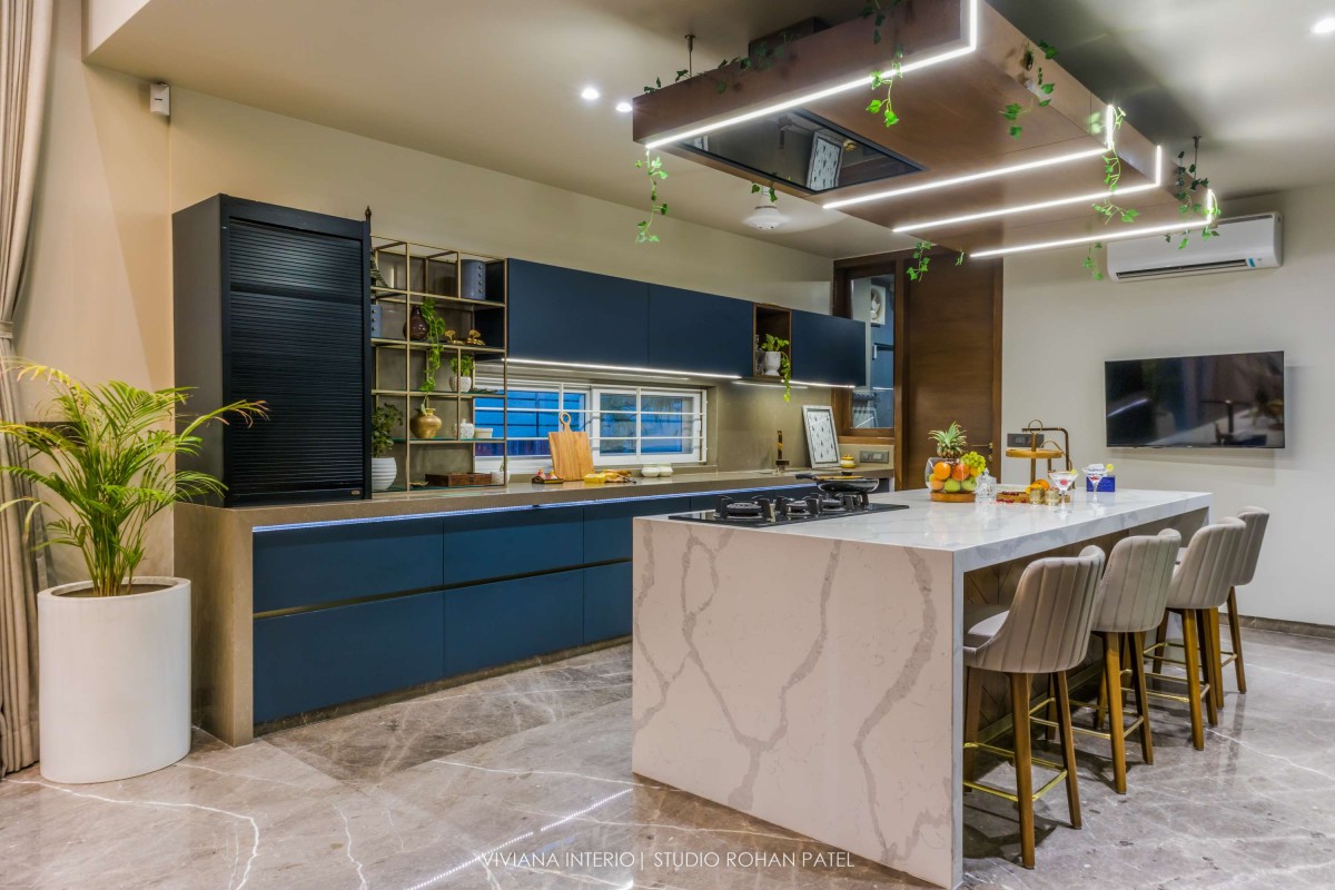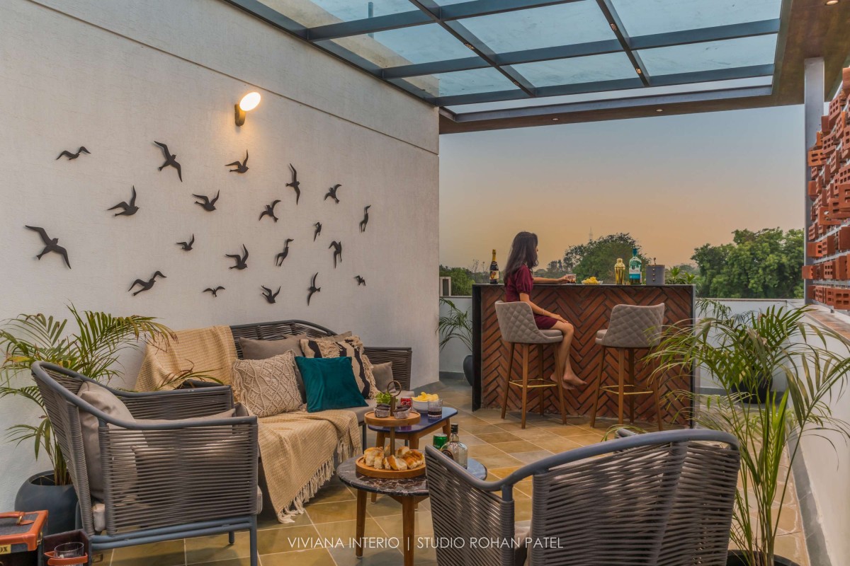 The designer, Priyanka Choksi designed the owner’s description into a tangible reality that can be cherished over time. From overall design to minute details, the house designed by Viviana Interio metamorphizes into fresh and clutter-free design. Out of total plot area 0f 6400 sq. ft., plinth area is of 2200 Sq. ft. comprising of a Living room, Kitchen, Dining area, one Guest bedroom on the ground floor, one master bedroom, one kid's bedroom, one guest bedroom, and pooja space accommodated on the first floor and one master bedroom with gazebo sitting on the second floor. The area of about 4200 Sq. ft. is covered with Landscaping, kitchen garden, fruit garden and swimming pool.