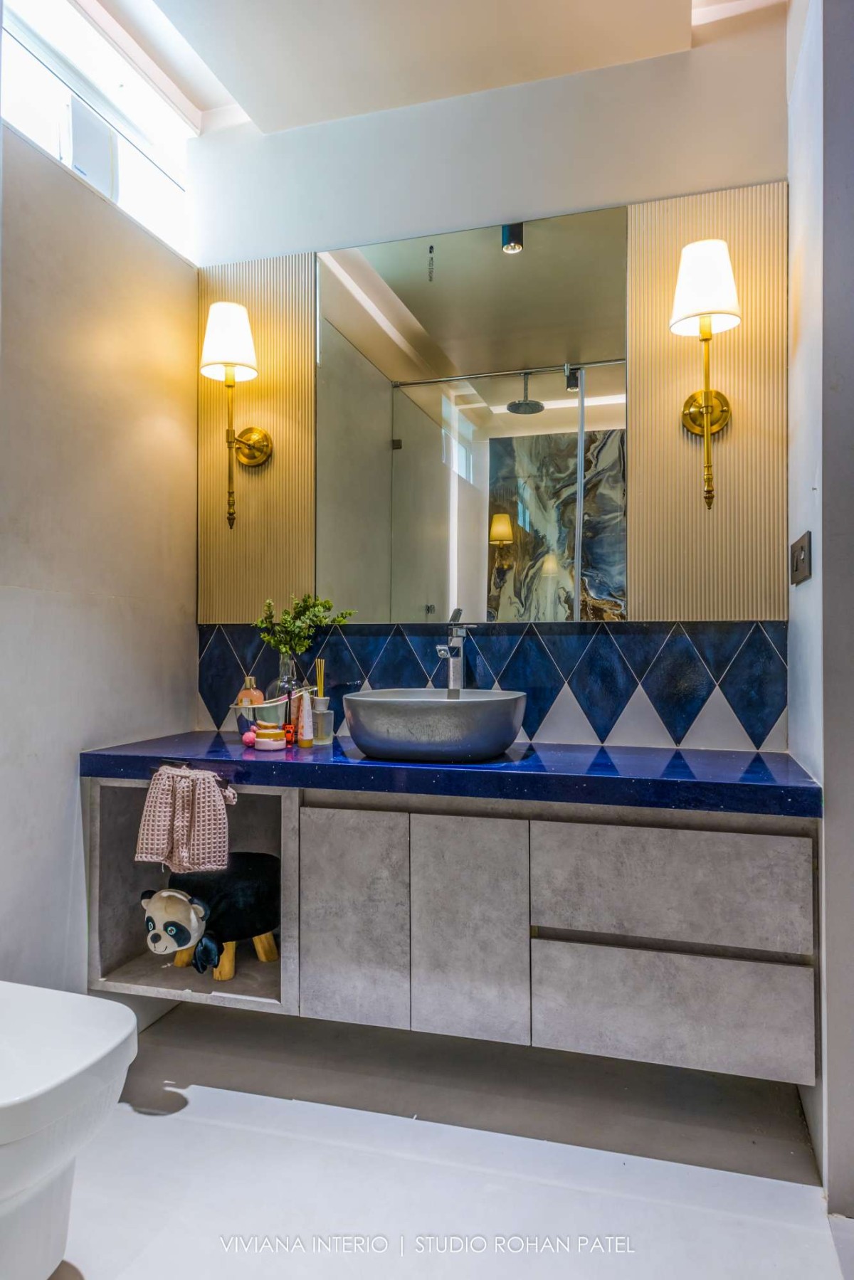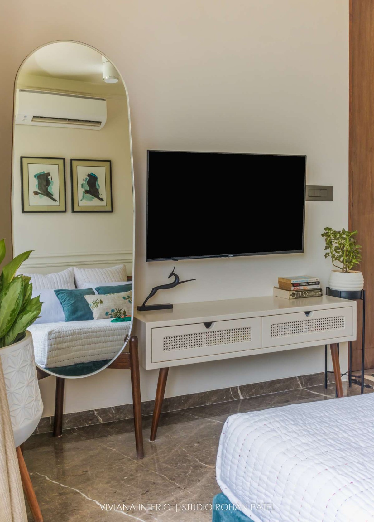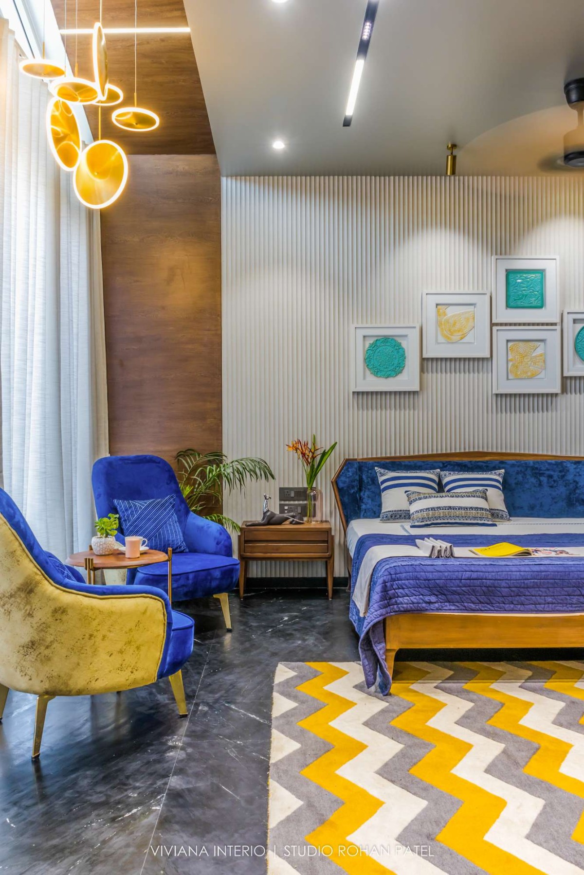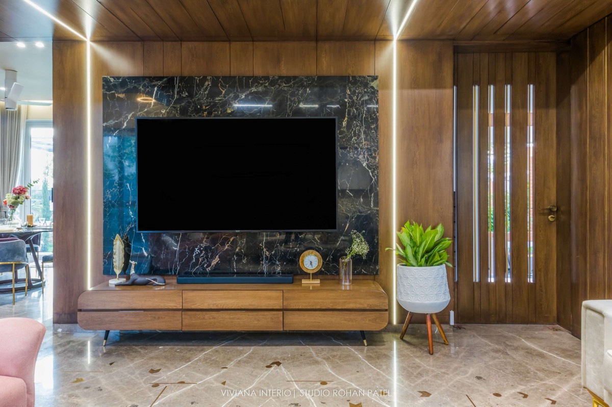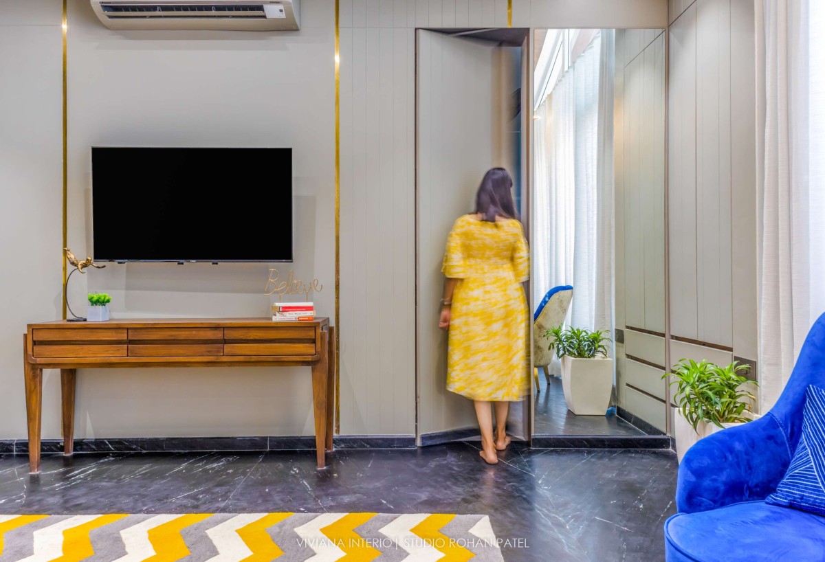 The designer, Priyanka Choksi designed the owner’s description into a tangible reality that can be cherished over time. From overall design to minute details, the house designed by Viviana Interio metamorphizes into fresh and clutter-free design. Out of total plot area 0f 6400 sq. ft., plinth area is of 2200 Sq. ft. comprising of a Living room, Kitchen, Dining area, one Guest bedroom on the ground floor, one master bedroom, one kid's bedroom, one guest bedroom, and pooja space accommodated on the first floor and one master bedroom with gazebo sitting on the second floor. The area of about 4200 Sq. ft. is covered with Landscaping, kitchen garden, fruit garden and swimming pool.