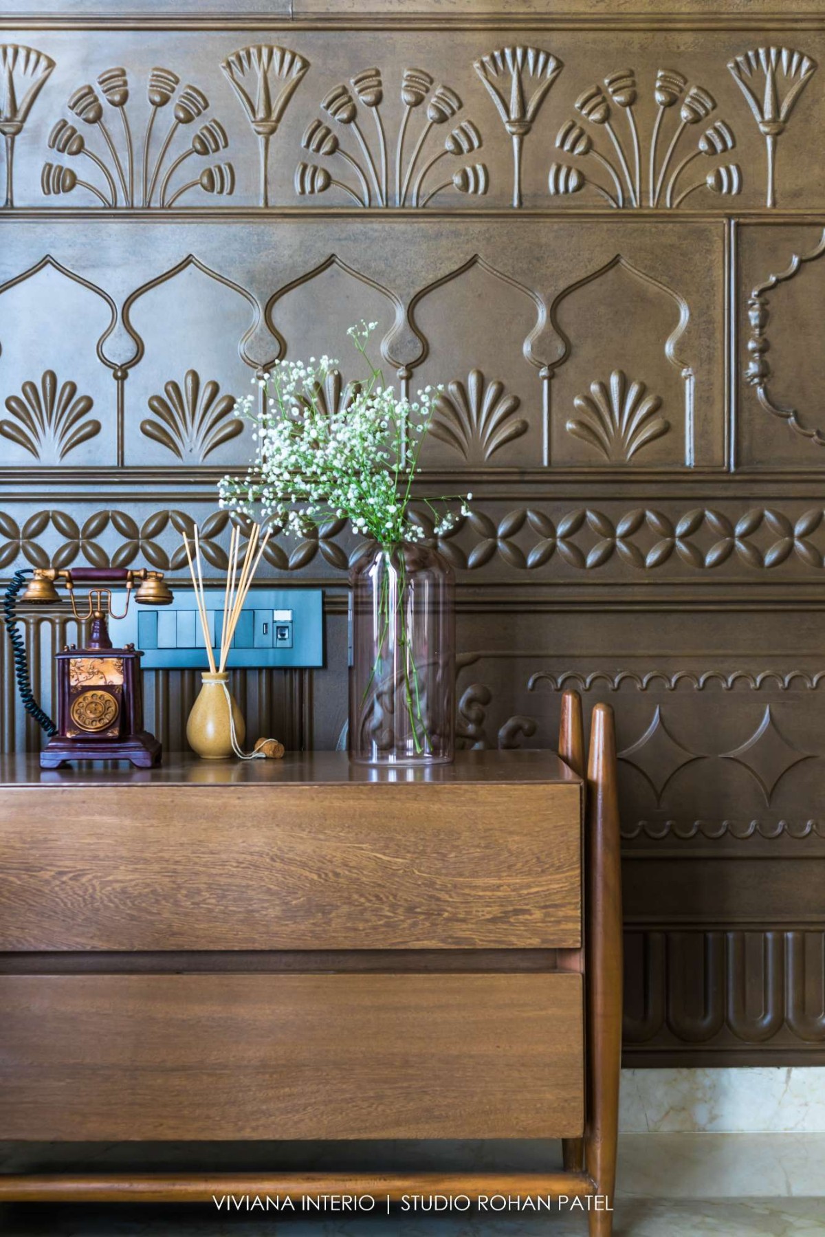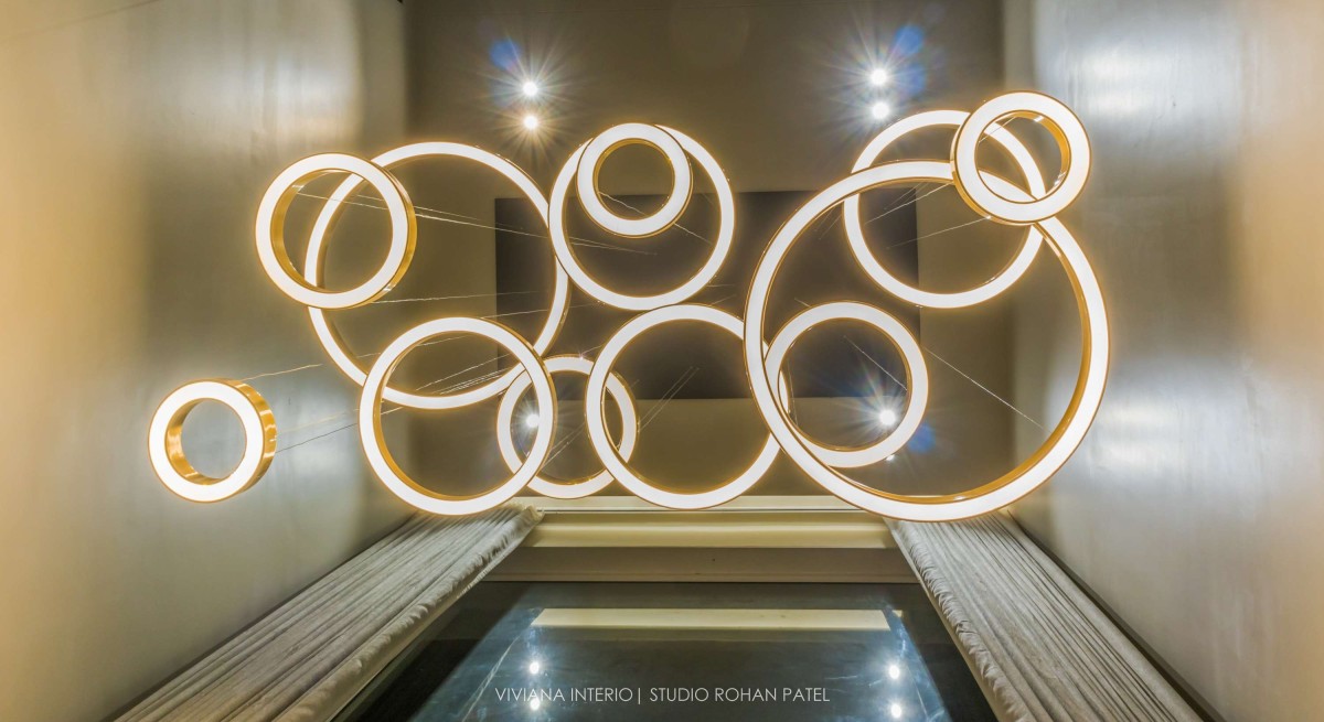 On the ground floor, the foyer walls and main door is designed with raw wood and brass. Ground floor flooring is of Italian stone. The grey Italian marble is continued in the living room with brass inlay in the flooring. Island kitchen platform is provided. In between the living room and kitchen, there is a double heightened ceiling where an elegant customized chandelier is placed.
