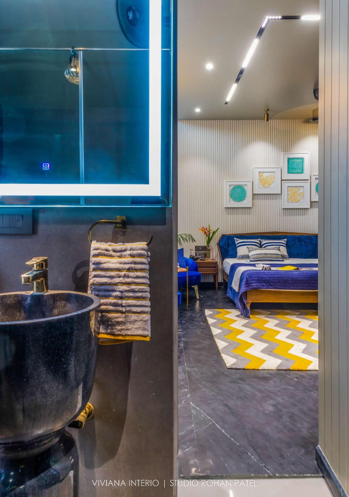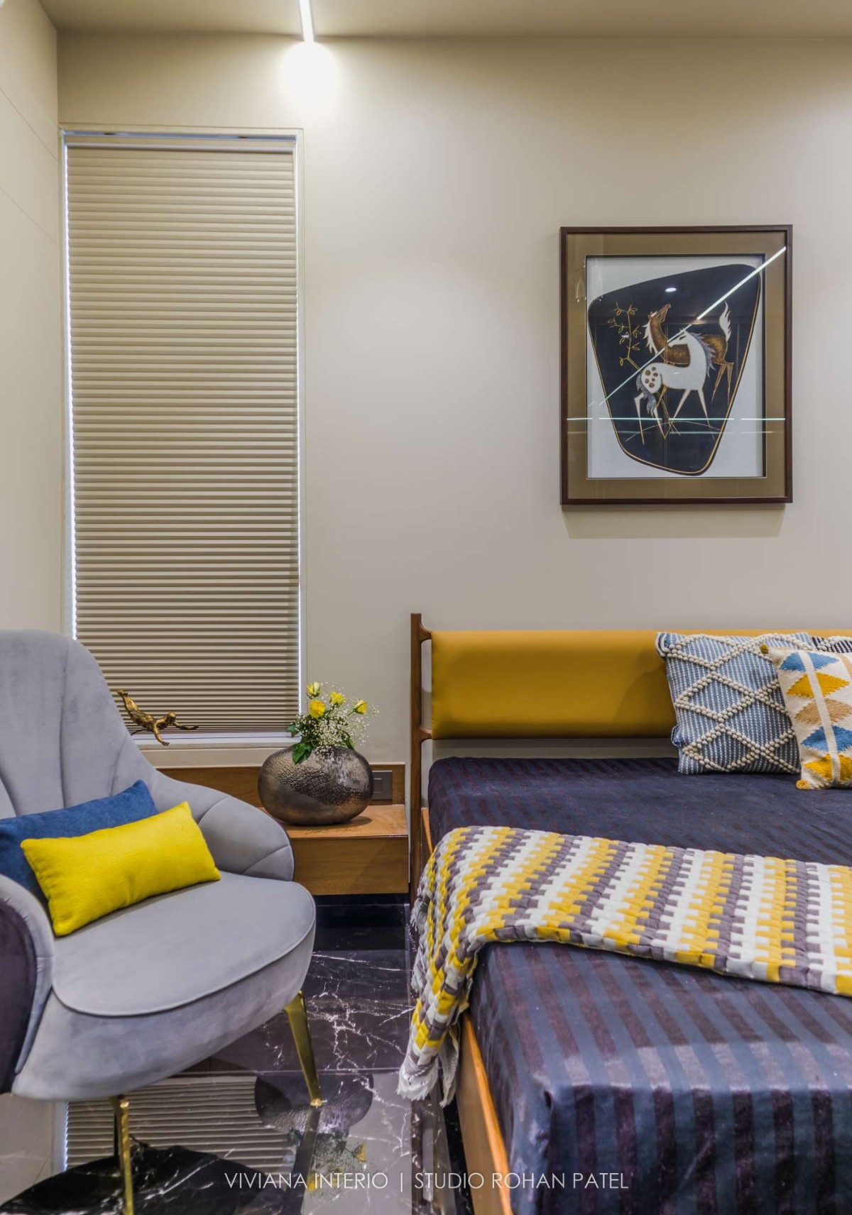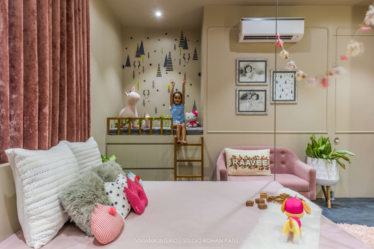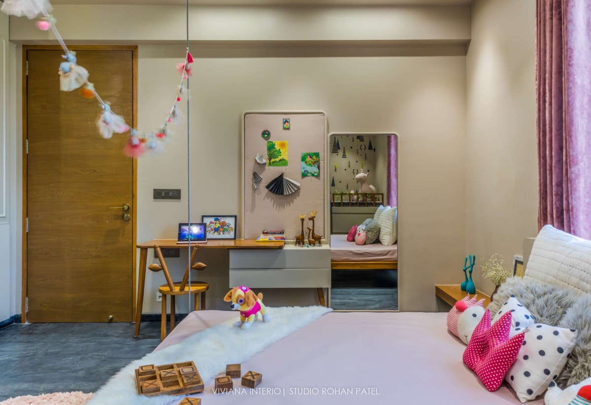 On the first floor, the flooring material is black slatestone which provided warmth inside the house. The floor comprises the master bedroom, kids bedroom, second guest bedroom, and mandir. All the spaces showcase their individuality, yet are conjunct. Simplicity in the ceiling and embellishments on the walls makes the space more mature and unique.