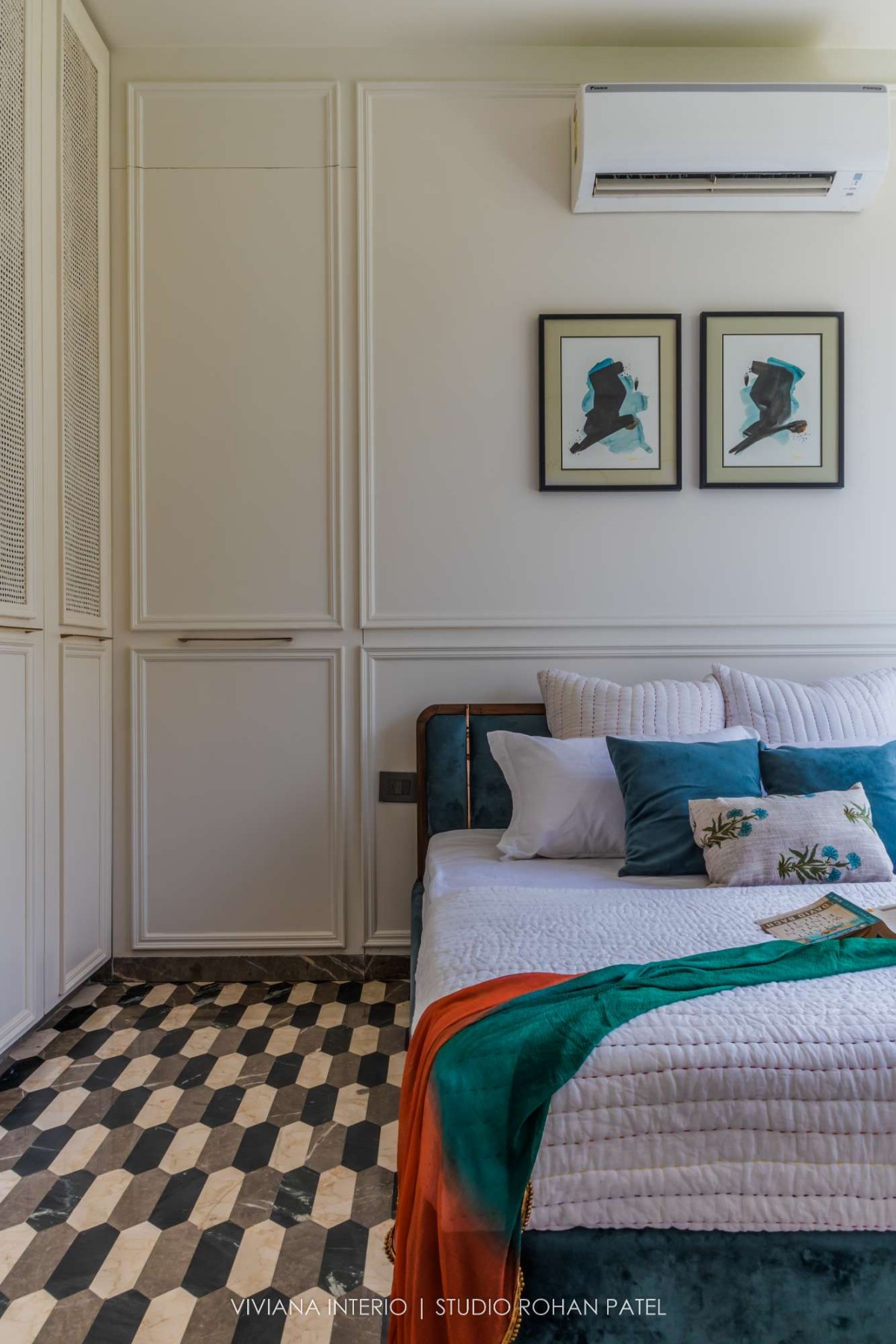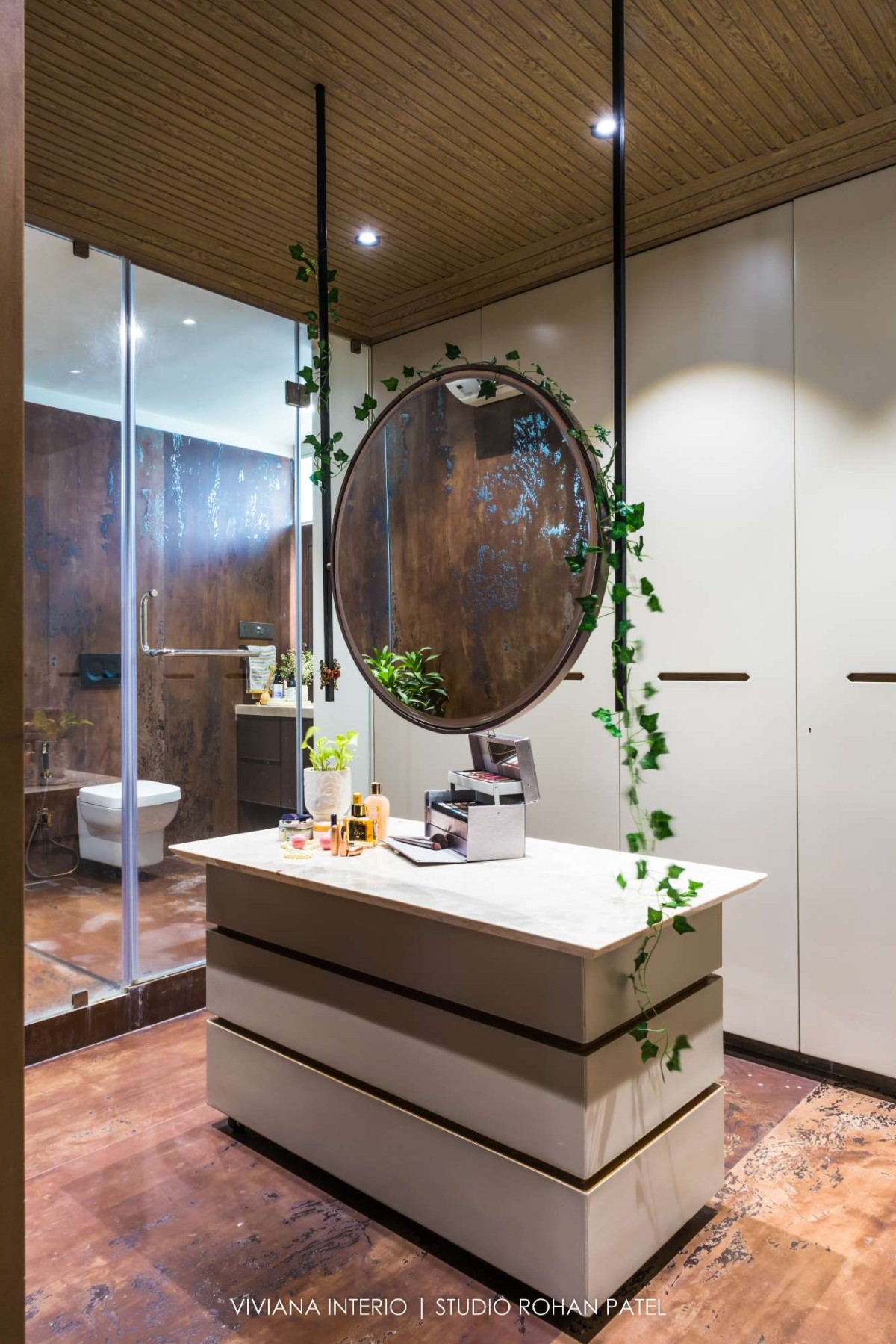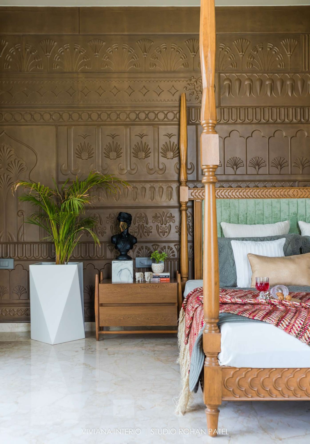 The second floor is a private zone composed of a grand master bedroom with a gazebo sitting. The bed is made up of hand-carved wood. The perfect details superiorities the room feel. The bathroom has an island dressing console with a round hanging mirror. All the materials such as stone, fabric, veneer, laminate and wood are handpicked for the client.
