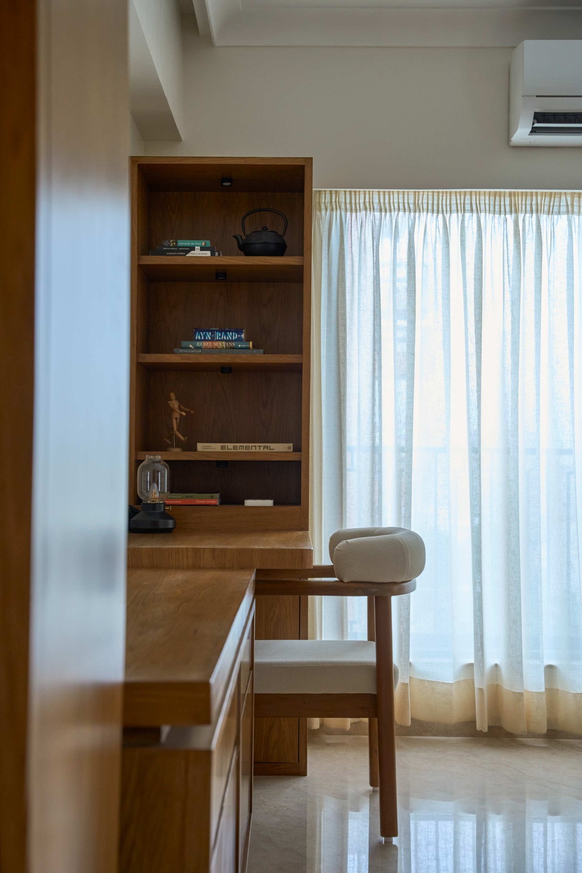 One of the most important design elements is the comprehensive use of walnut veneer across walls, ceilings, and furniture. It is not merely a finish, but a unifying language that governs the entire spatial experience. The alignment of furniture lines with the house’s structural grid further heightens this sense of coherence, making it a defining feature of the project.
