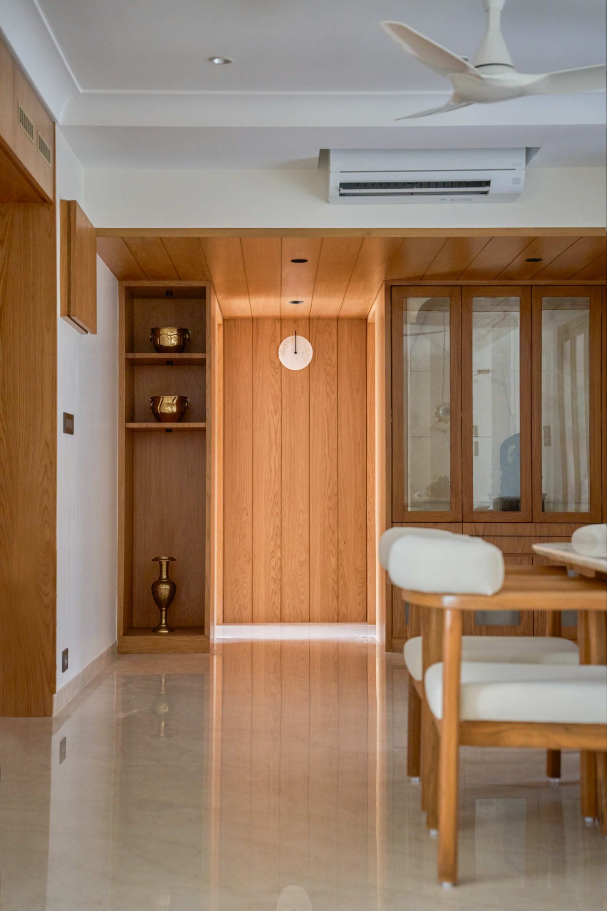 A unified view of dining, mandir, and crockery unit in the central area of Walnut Groove by Bombay Building Workshop