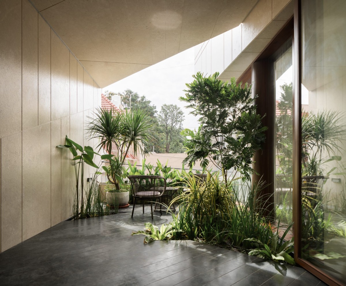 Informal living of Exterior view of Wedge Villa by Cadence Architects