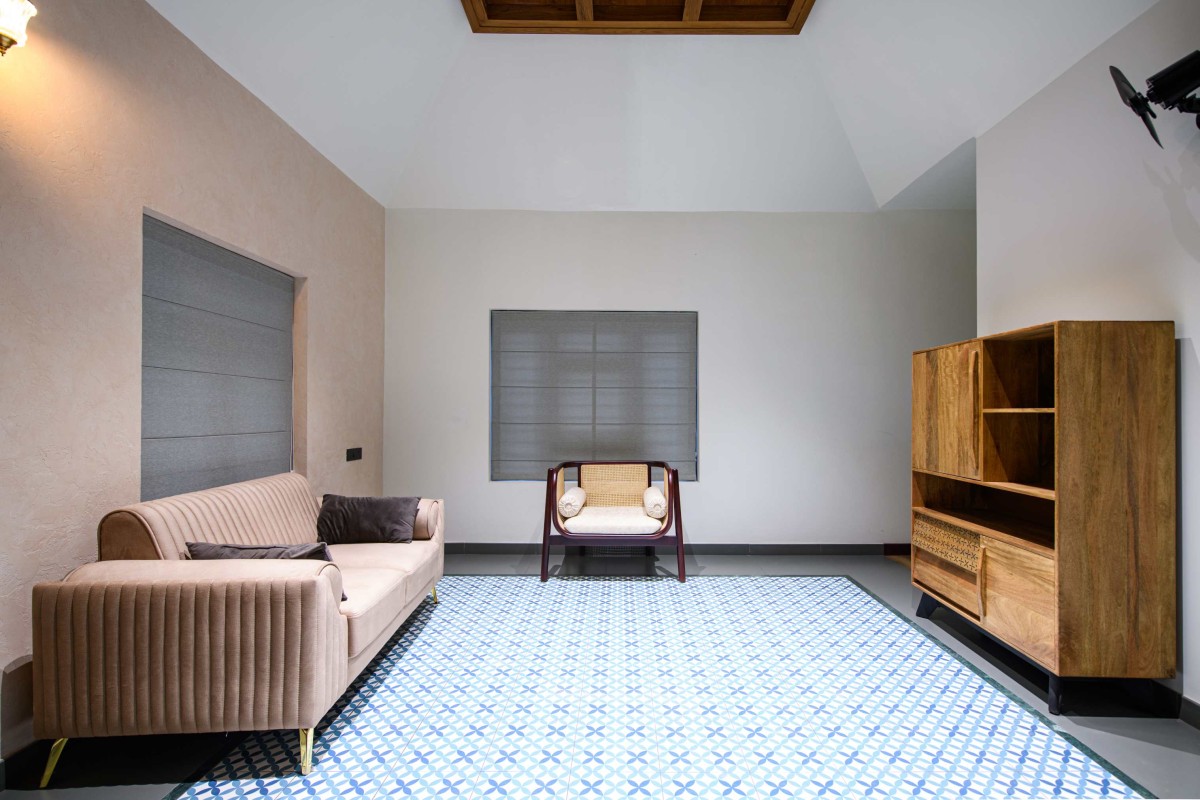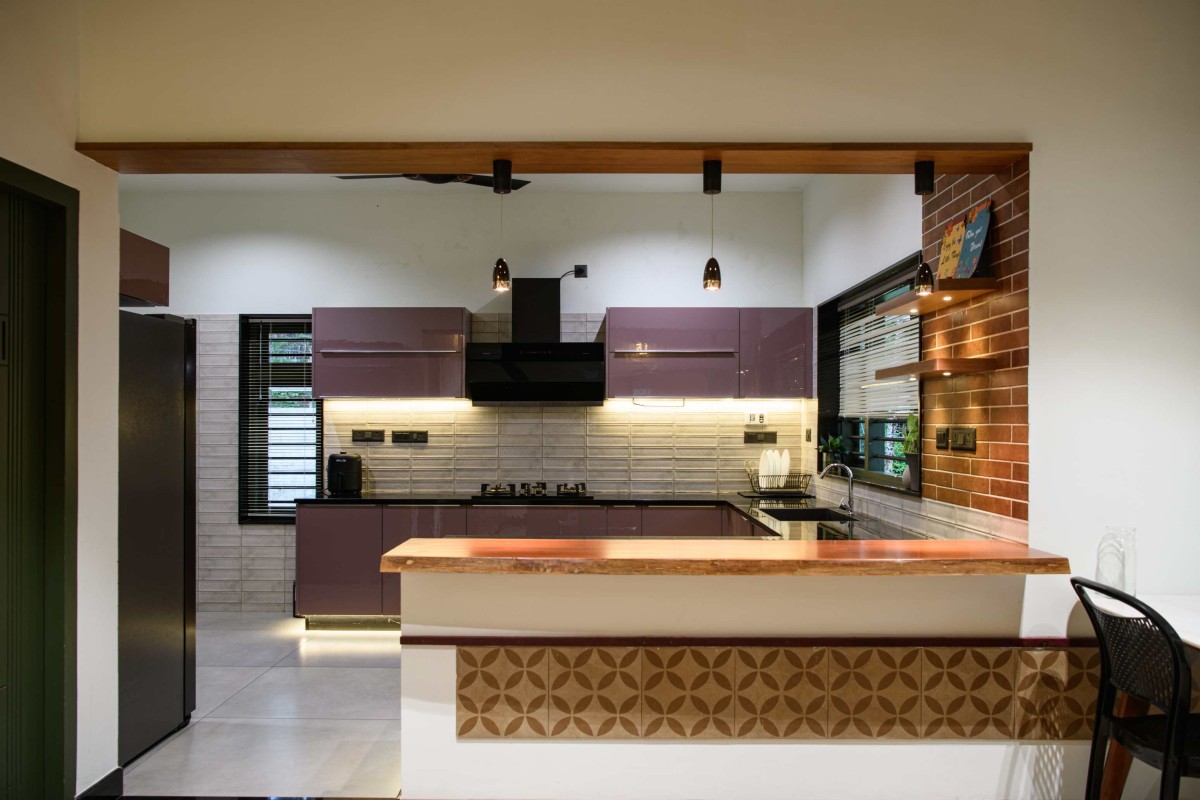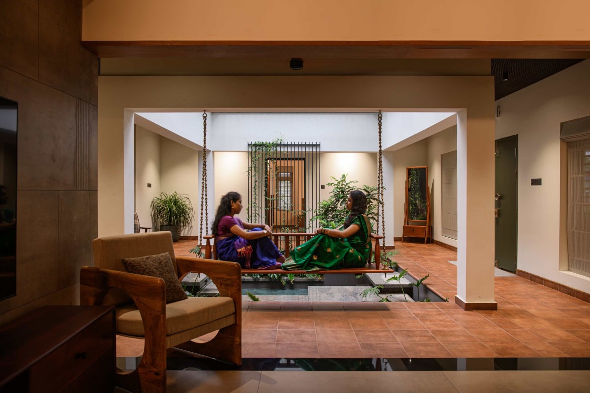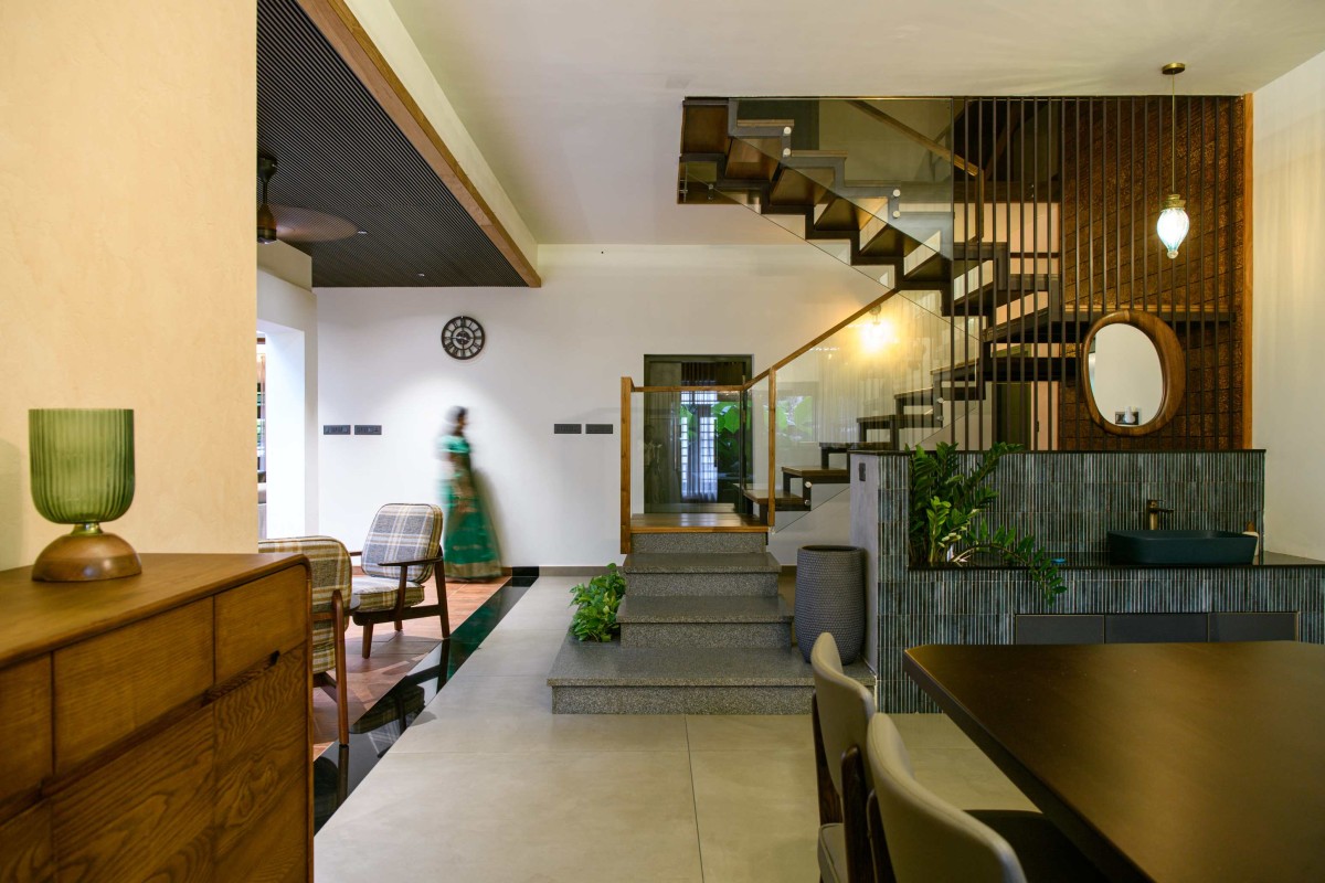 The house is organised around a central courtyard which acts as the heart and lungs of the house. It helps control the microclimate of the home, while guiding airflow throughout the house. The internal courtyard references the essence of a traditional Kerala courtyard with a fresh approach. It brings in greenery into the heart of the home, blurring the threshold between inside and outside. The formal living and dining spaces wrap around this courtyard. From here, you understand how the house works. The dining opens to a patio overlooking a  private garden. The family living is planned in a way that it gets privacy from the rest of the house and so is the kitchen.