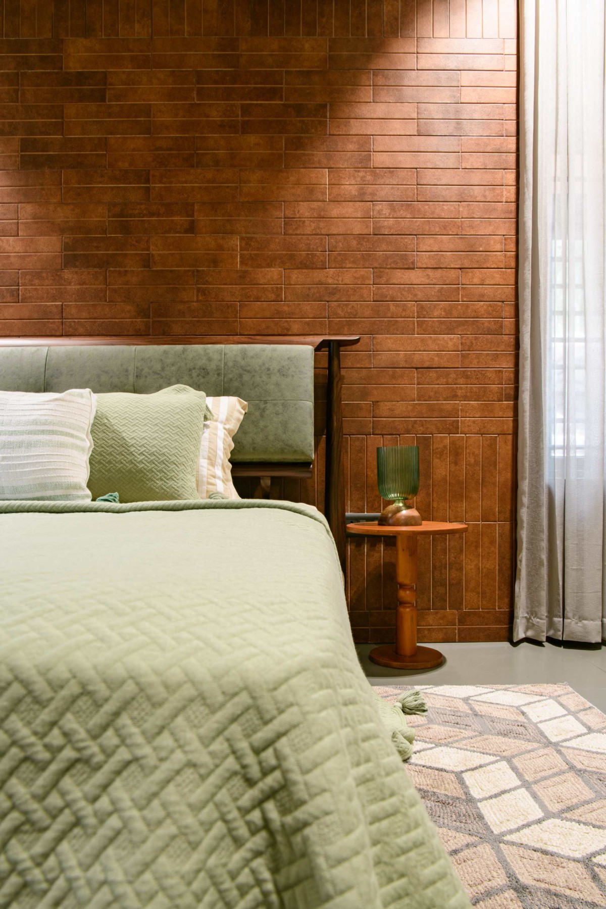 Inside, the earth-toned exterior continues naturally. The material and colour palette stays consistent throughout the house: Stone, brick, wood. This continuity is brought in through handpicked furniture, fabrics, and textures. Green accents appear in doors, window frames, and backdrops, sometimes subtle, sometimes a little bolder. It’s a small touch but it brings the whole house together.