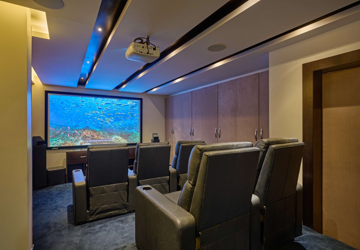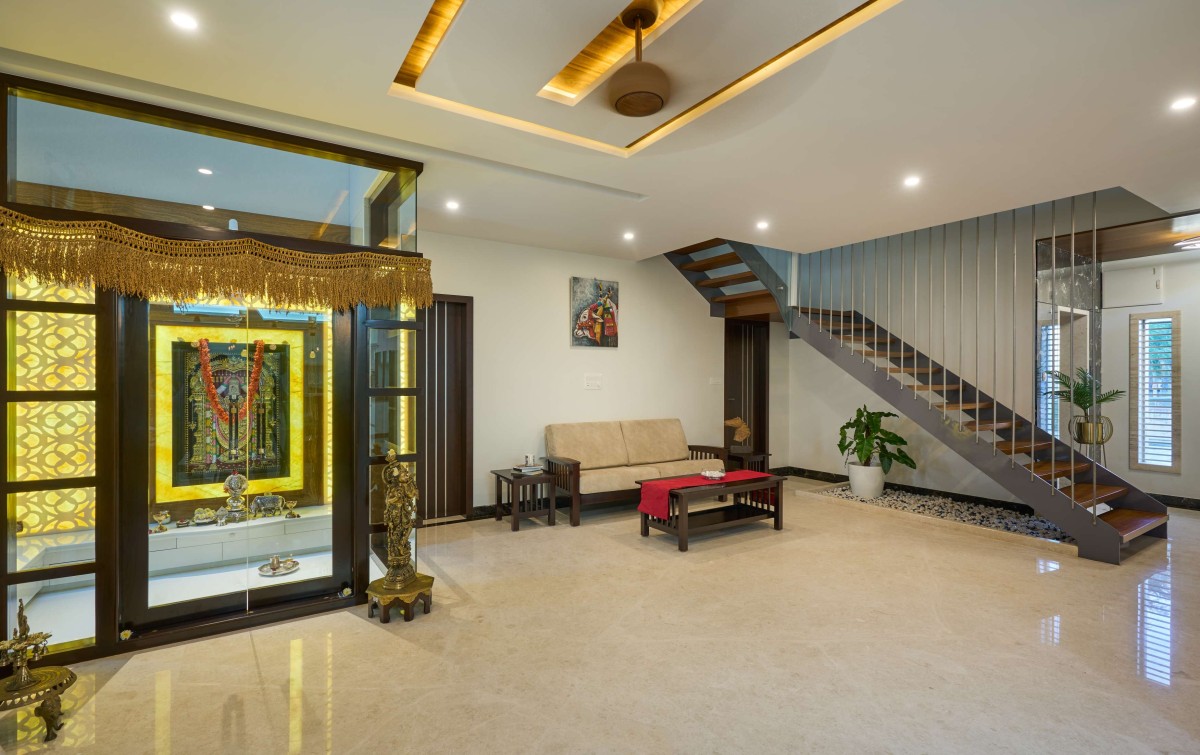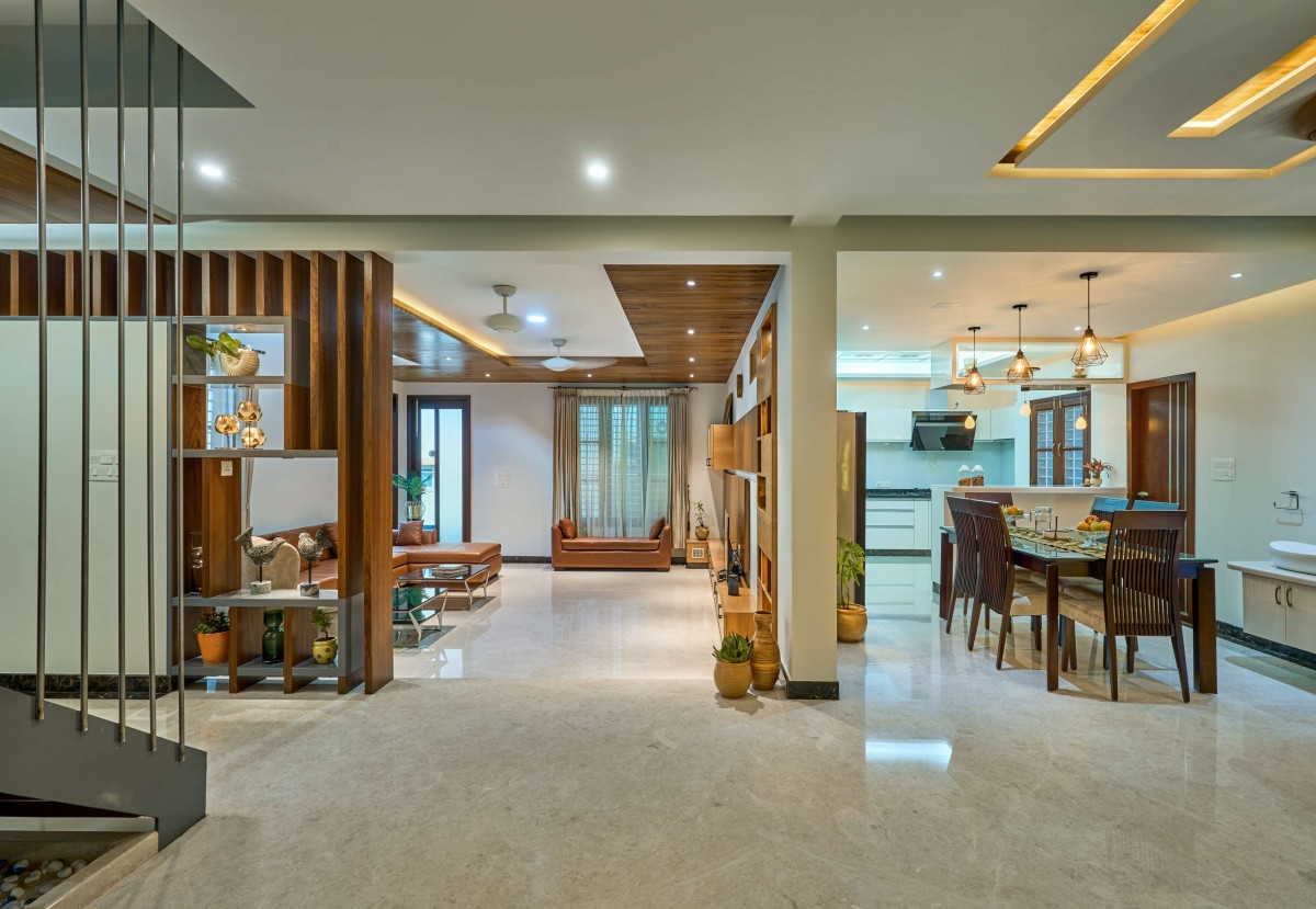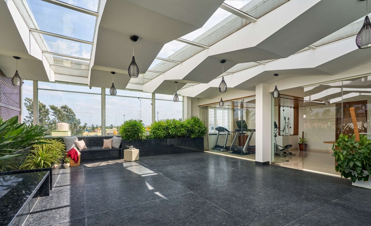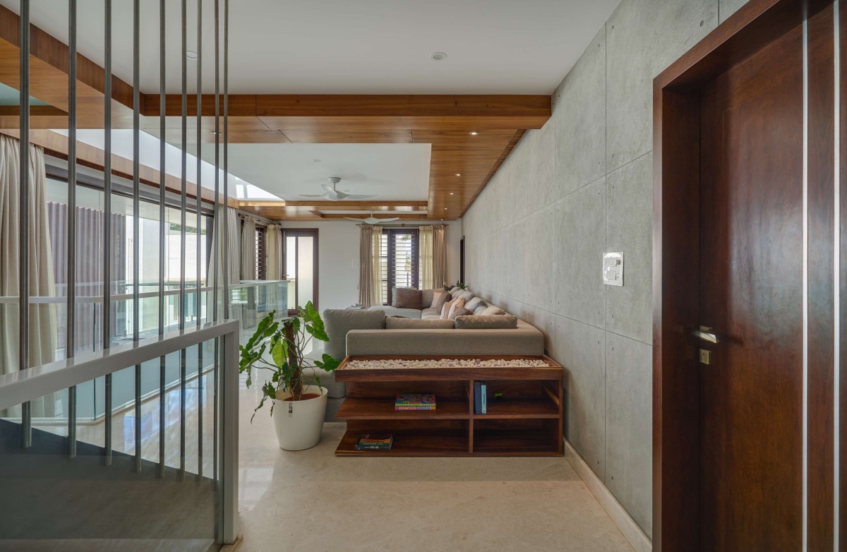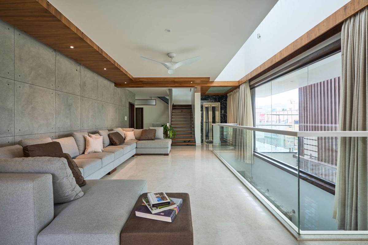 The first floor is dedicated to the family with all private spaces like the kitchen, dining and living spaces located there. The second floor is designed to be completely private with the bedrooms located there. The stairs continue up to a third floor that provides access to the entertainment zone that houses a home theatre, gym and a roof garden.