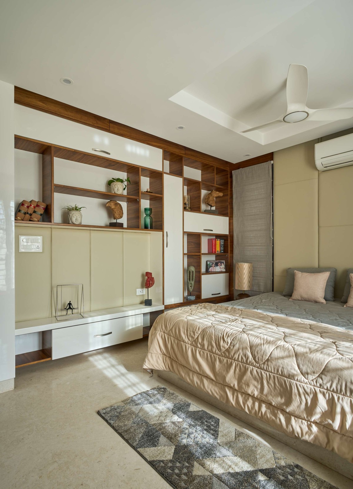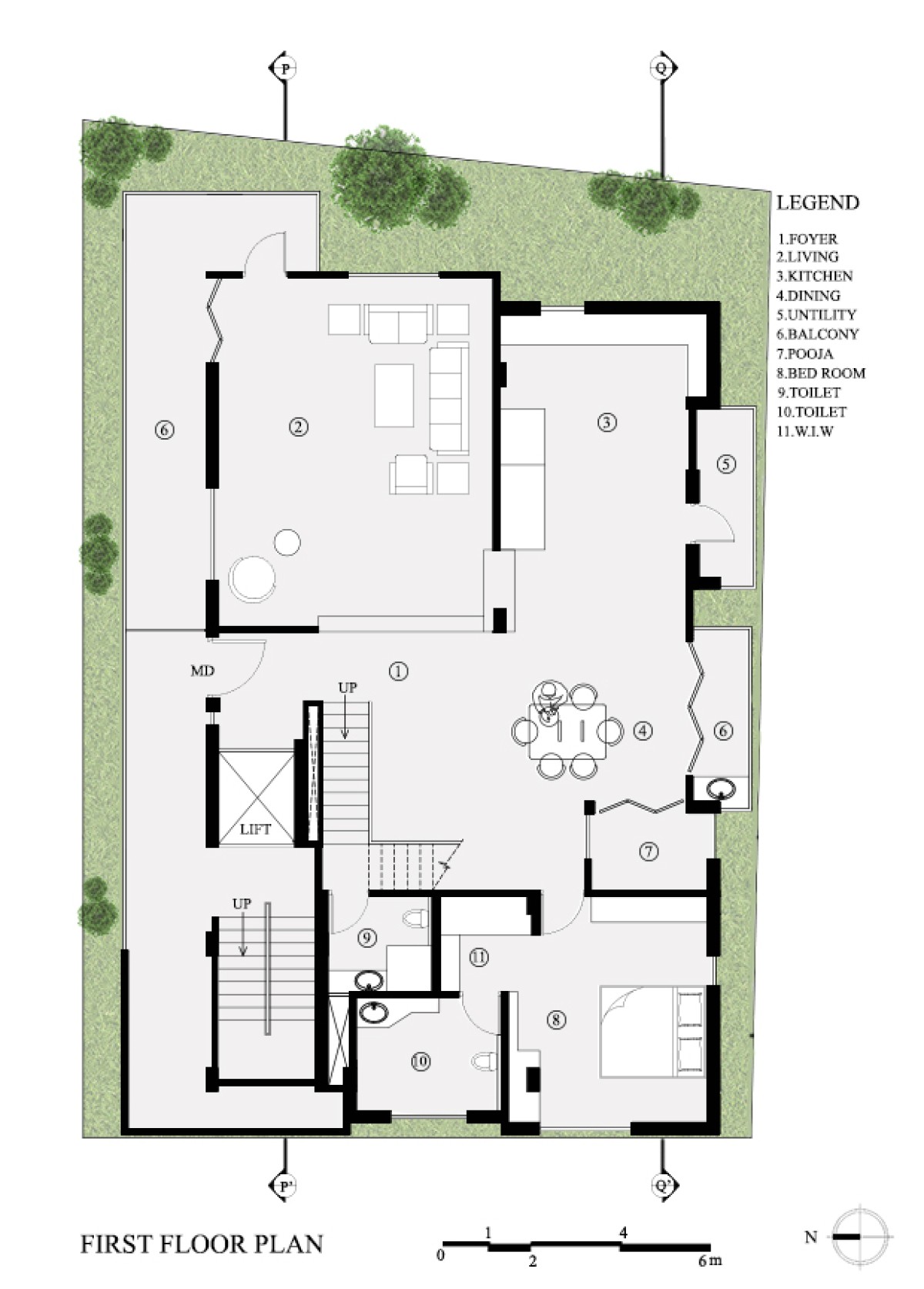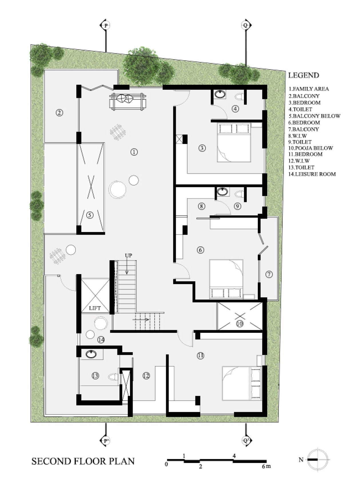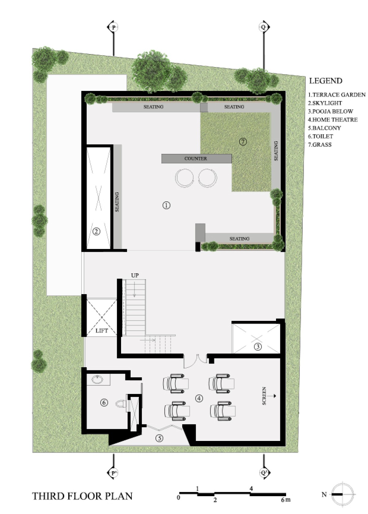The first floor is dedicated to the family with all private spaces like the kitchen, dining and living spaces located there. The second floor is designed to be completely private with the bedrooms located there. The stairs continue up to a third floor that provides access to the entertainment zone that houses a home theatre, gym and a roof garden.