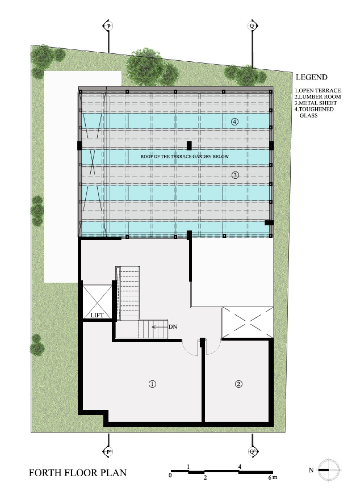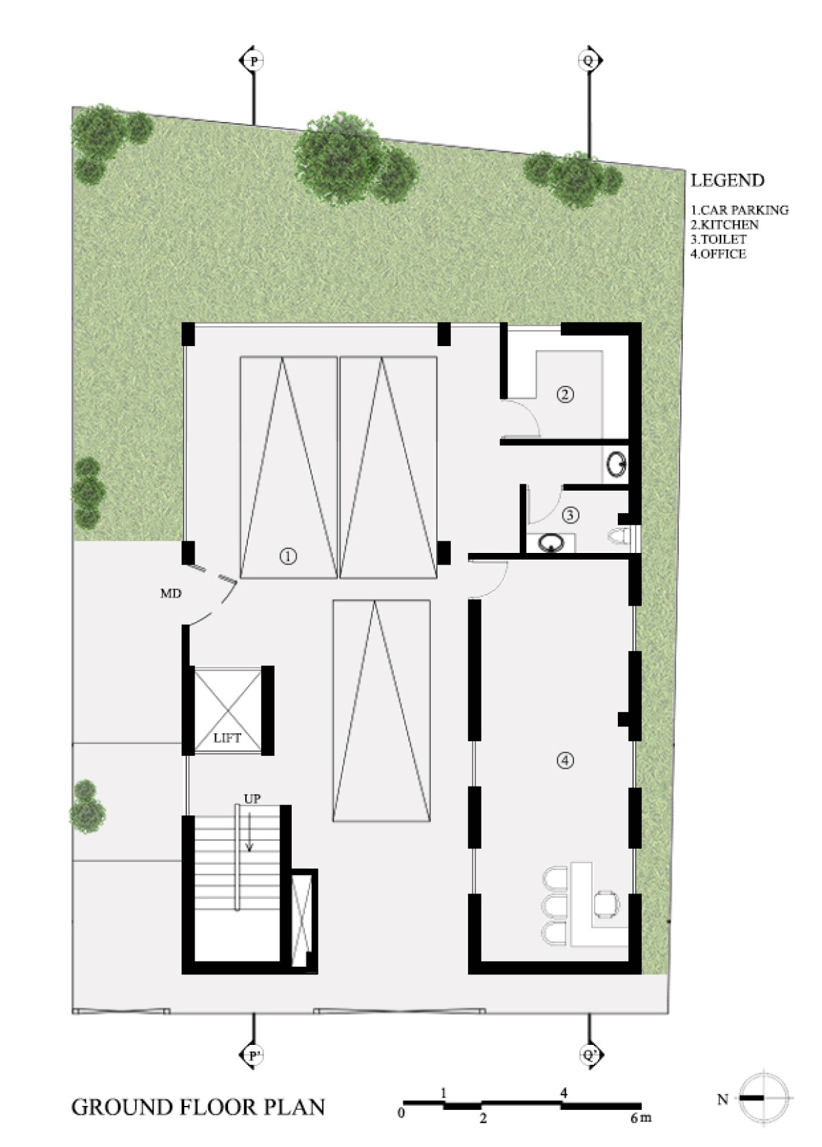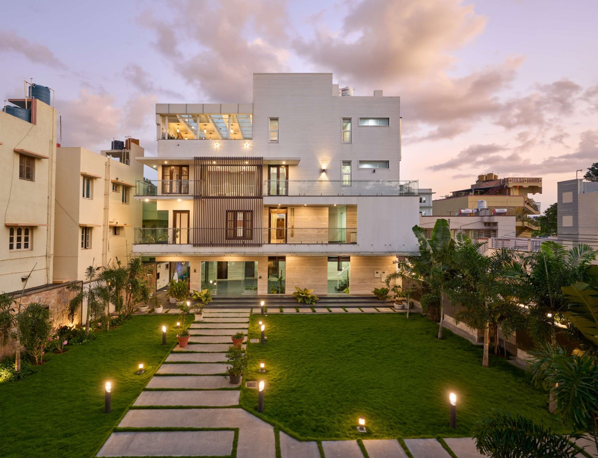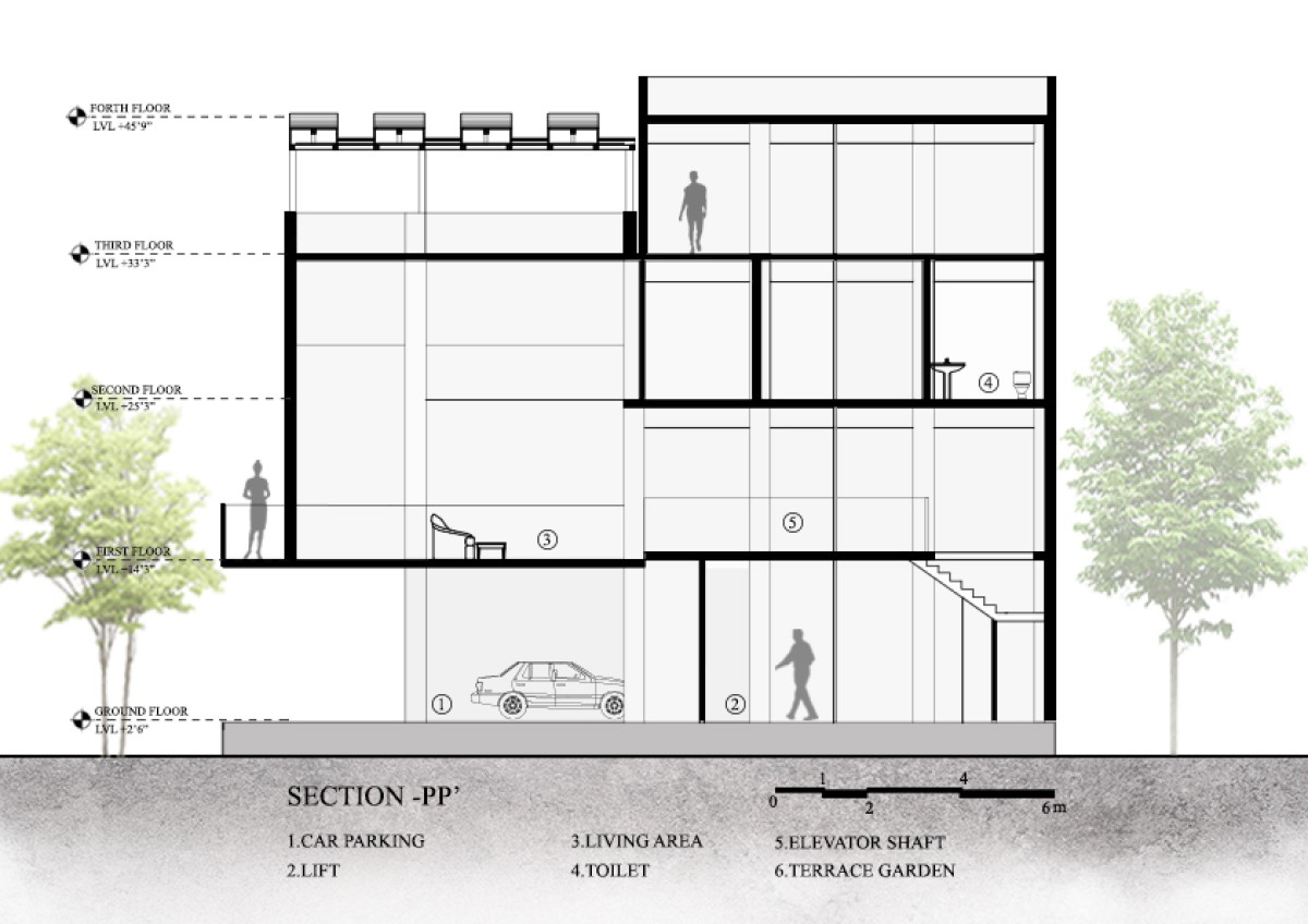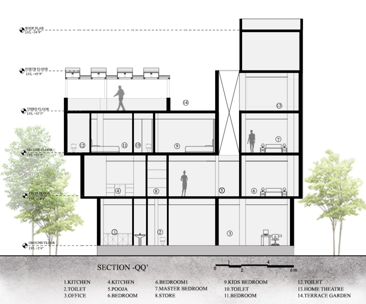 The house is divided into four floors with the focus on spatial planning. The ground level contains an office space, parking area and a multi-purpose space along with a kitchen designed to transition seamlessly into the garden space.