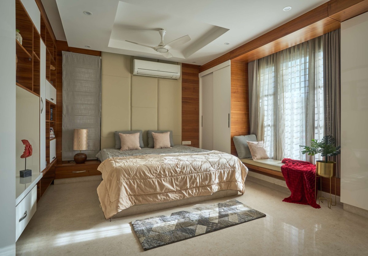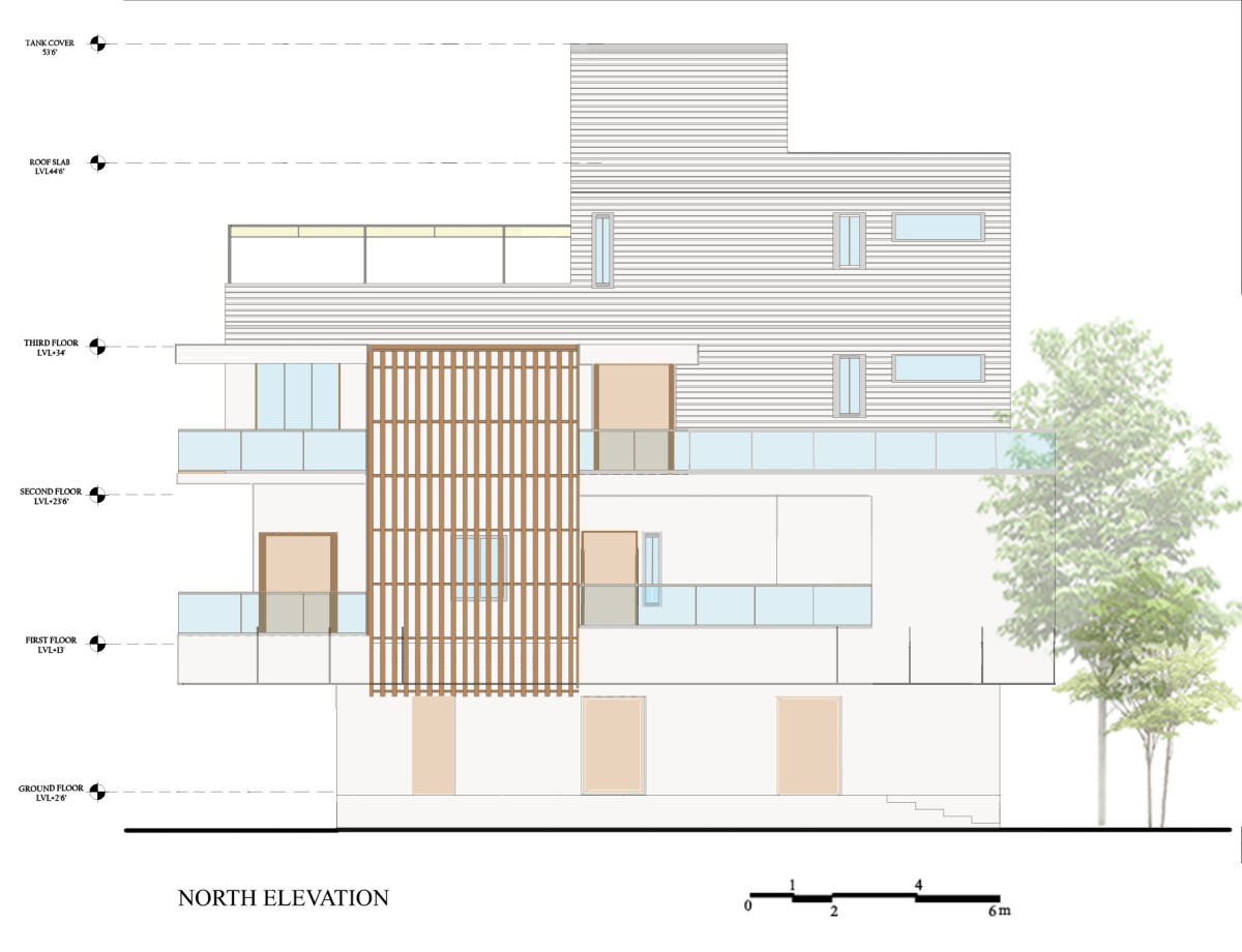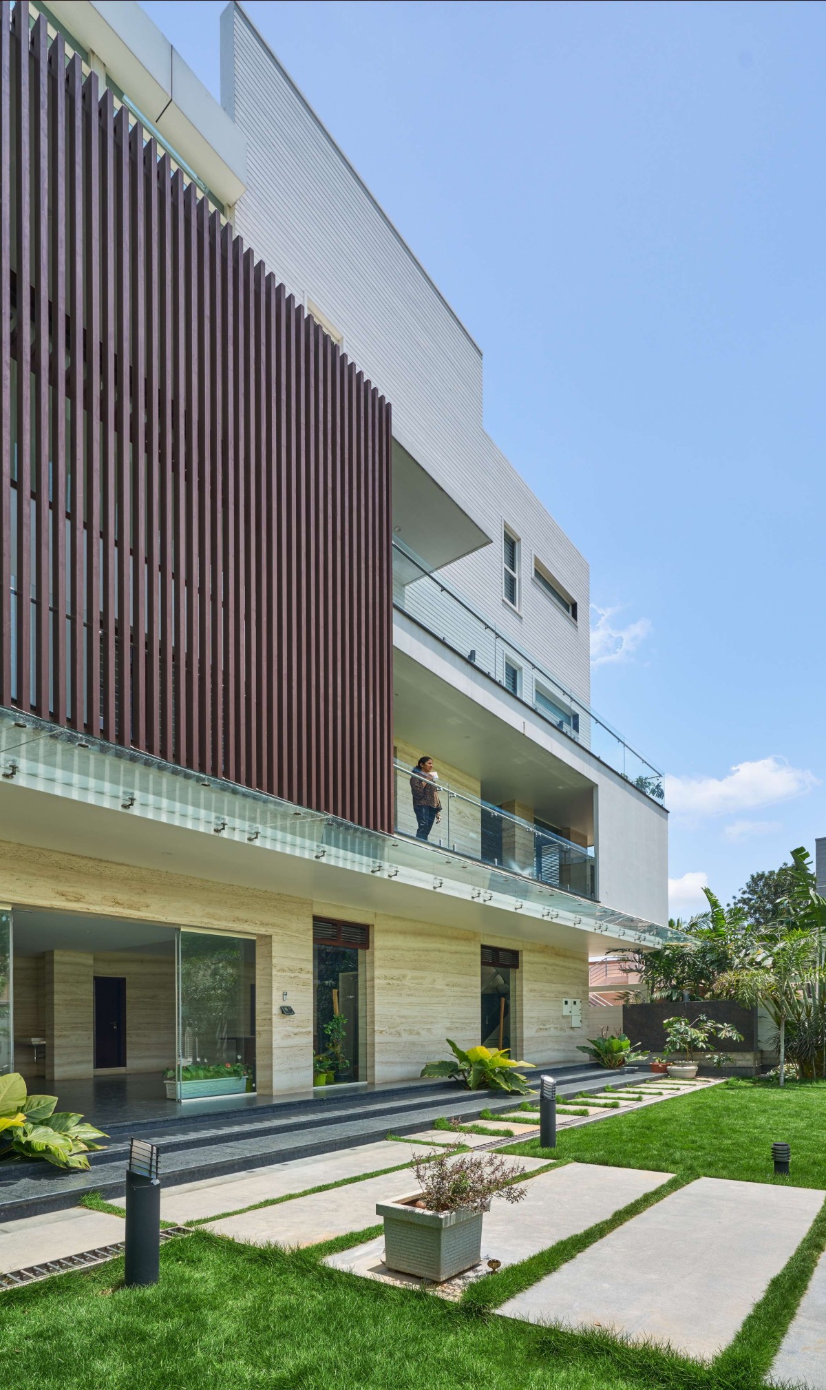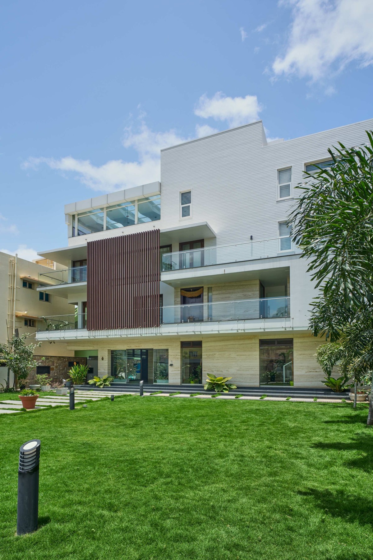 The terrace roof is one of the highlights of the building, it has a fluidic design with the primary element being steel. The facade design is minimalistic with plaster finish horizontal grooves incorporated along with vertical wooden slats to give a modern look to the built form. The voids within the built form lend it character in the form of fenestration and accommodates features that are both aesthetic and functional.