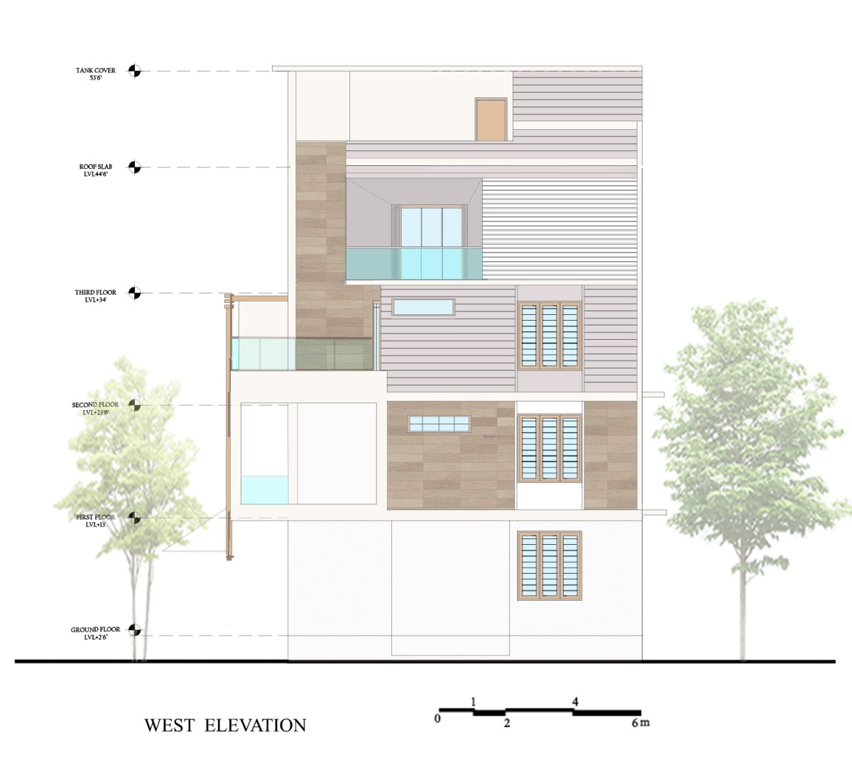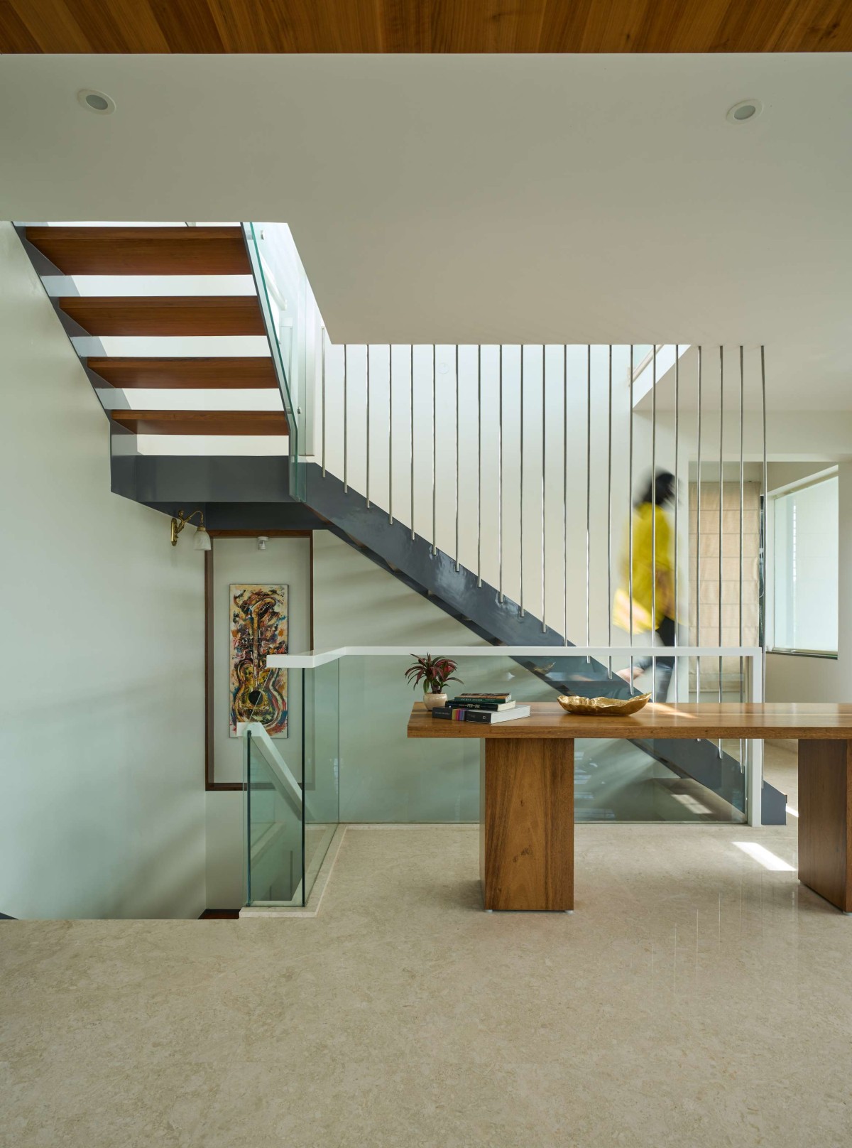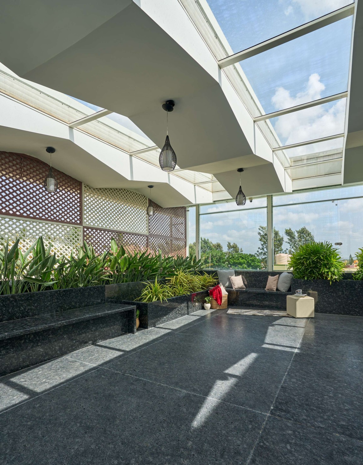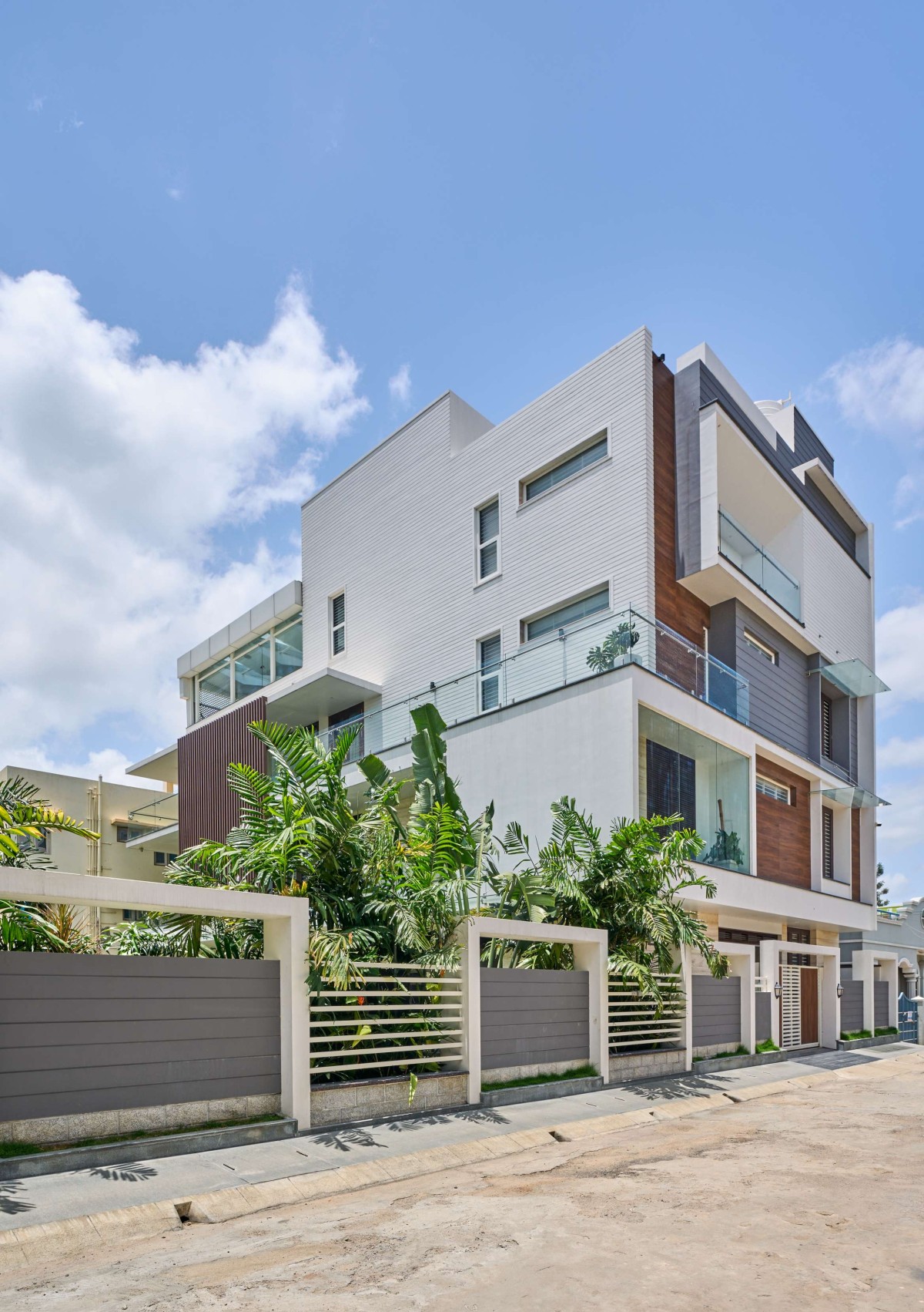 The terrace roof is one of the highlights of the building, it has a fluidic design with the primary element being steel. The facade design is minimalistic with plaster finish horizontal grooves incorporated along with vertical wooden slats to give a modern look to the built form. The voids within the built form lend it character in the form of fenestration and accommodates features that are both aesthetic and functional.