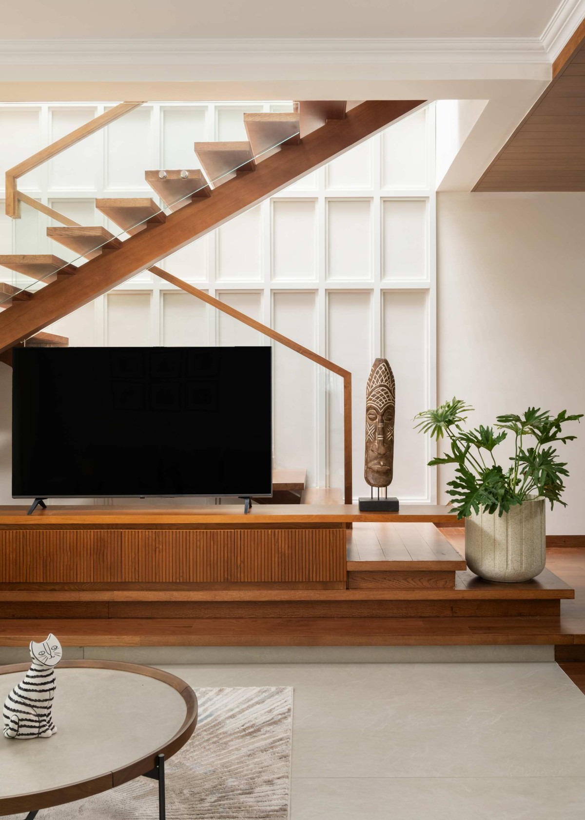 The custom-designed TV unit is seamlessly integrated with the staircase, forming a cohesive architectural composition rather than a standalone element. Positioned against a backdrop of paneled walls, it aligns with the stair geometry, reinforcing visual continuity within the space. A skylight above the stairwell introduces diffused natural light, enhancing the warmth of the wooden surfaces and ensuring the area remains well-lit throughout the day. The inclusion of indoor plants softens the composition, adding a layer of vitality to the otherwise restrained palette.
